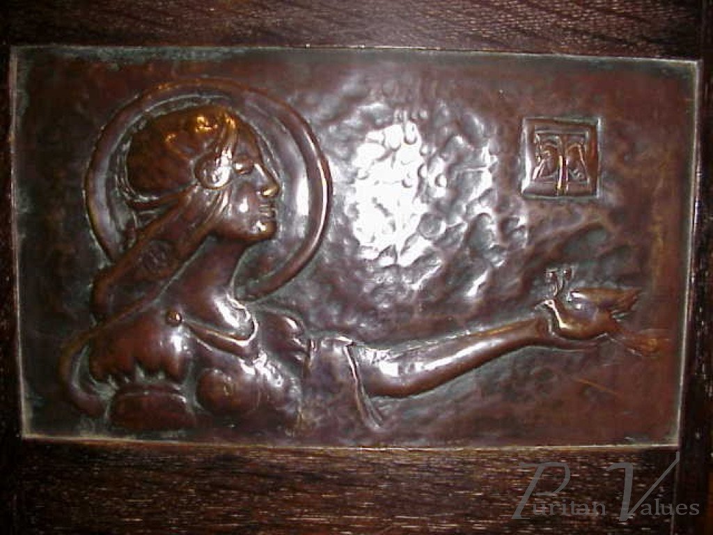 A Beautiful pair of Glasgow School copper pictures with hand worked stylised detail depicting Maidens with Halo's holding a bird in their hand in their original oak frames. Height 13", Width 10 3/4". Circa 1900.