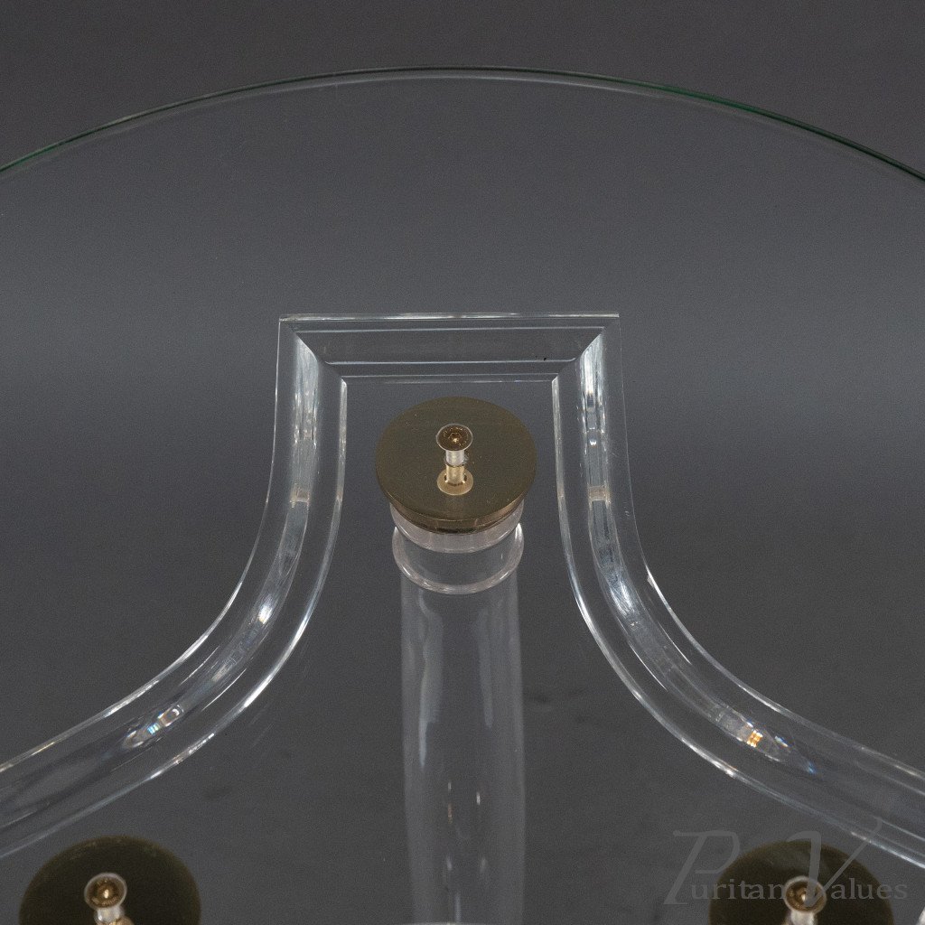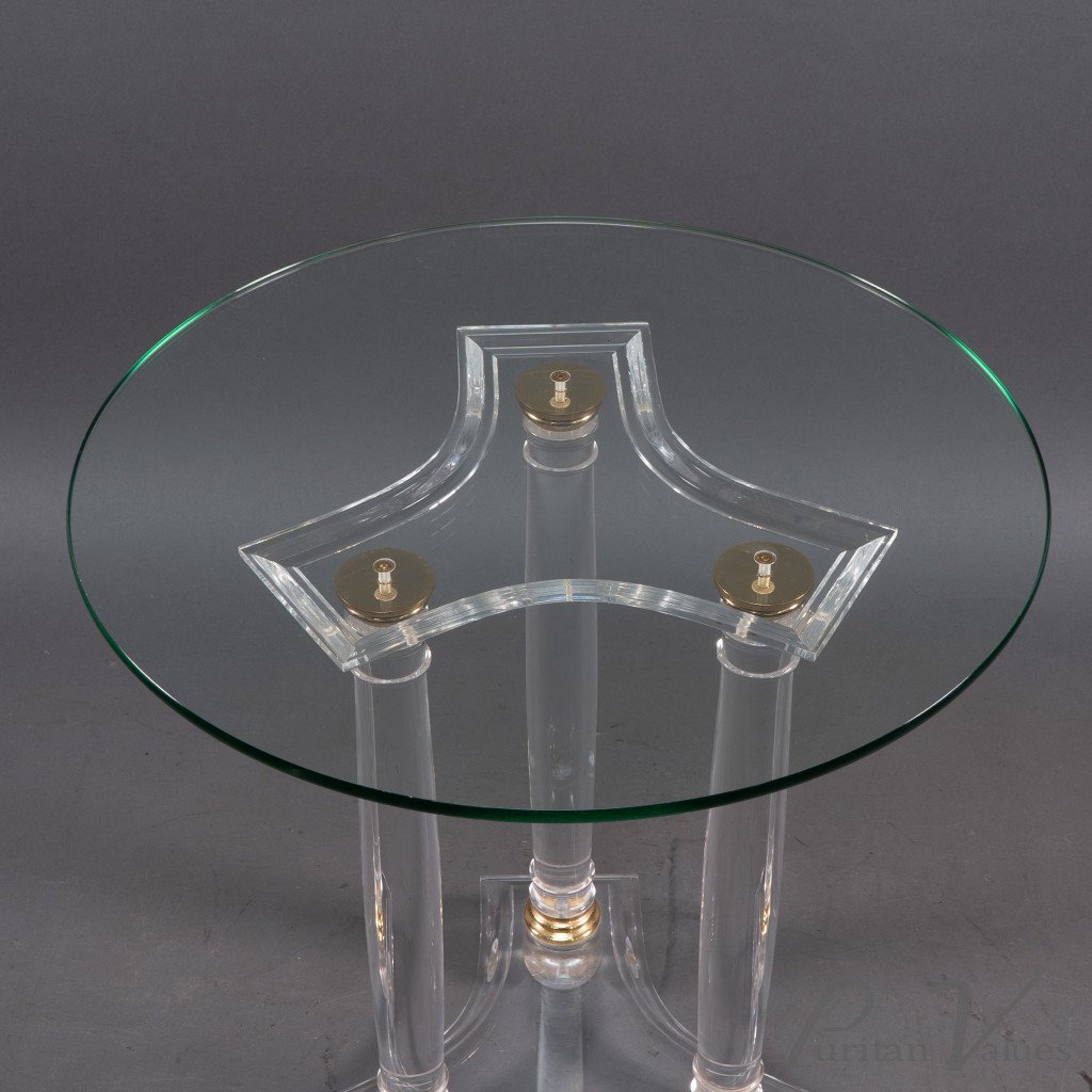 A French Mid-Century Modern circular side table, circa 1970, with a thick glass top raised on three lucite column supports accented with brass mounts. The combination of clear lucite and polished brass captures the bold yet refined aesthetic of 1970s French design, where modern materials were used to striking decorative effect. Its compact circular form makes it a versatile piece within the vocabulary of Mid-Century Modern furniture.