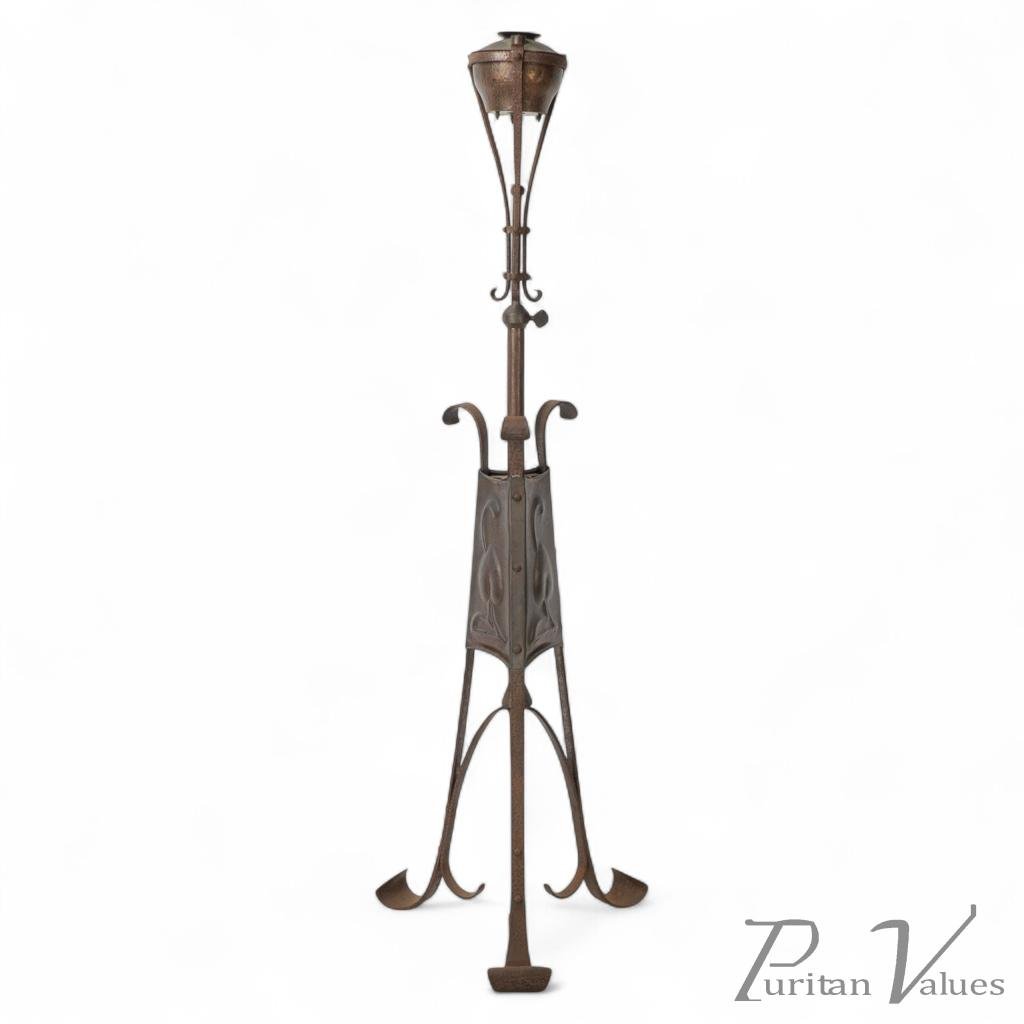 This Glasgow School standard lamp, circa 1900, reflects the geometric elegance of the Arts & Crafts Movement in Scotland. The tall tapering frame rises from a tripod base with curved feet, each panel decorated with stylised cut-outs that introduce subtle surface patterning. The upper section supports a simple socket and collar, allowing for a variety of shade fittings.