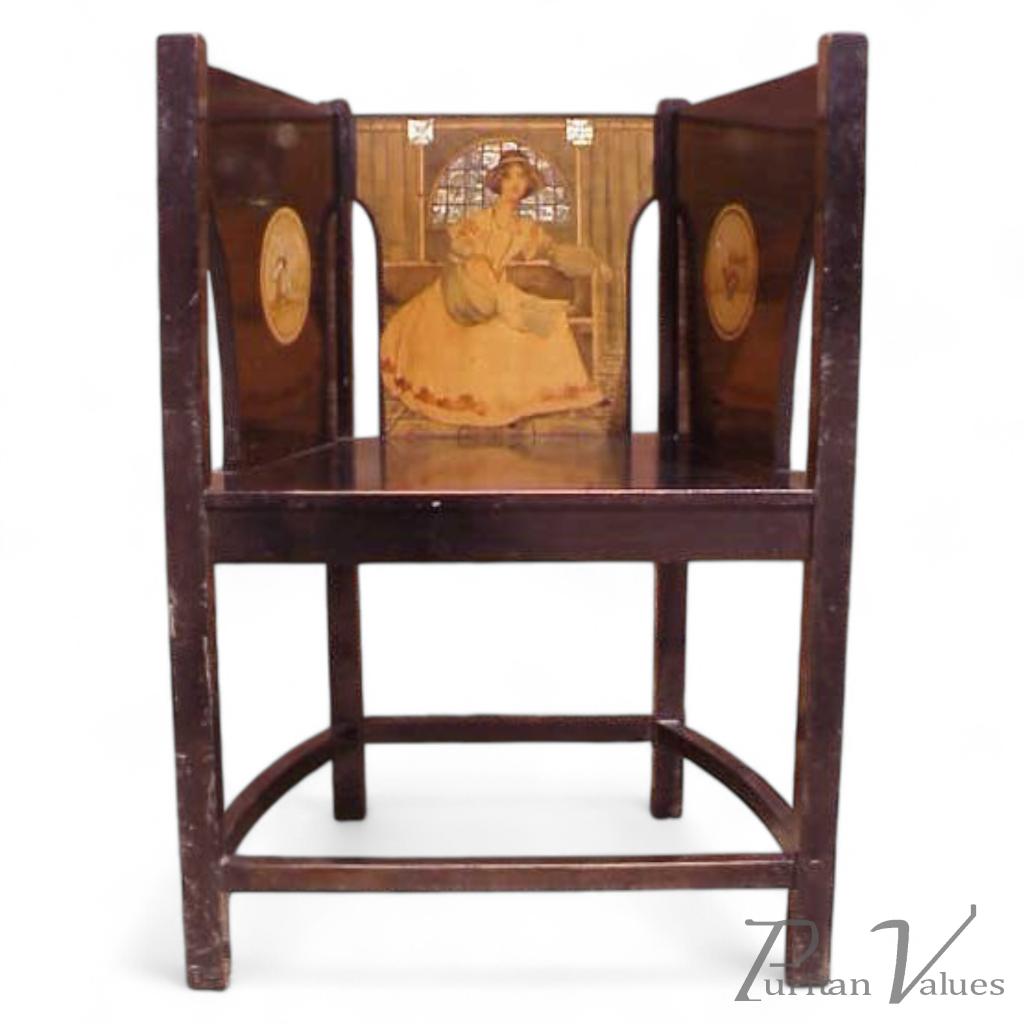A Glasgow School tub chair with the most incrediable inlaid back panel of a Glasgow School Maiden and a windmill and Galleon to the inner sides it is inlaid with Fruitwoods, Mother of Pearl and Abalone with artist painting and detailing to a very high quality. A very pure design. Circa 1900.