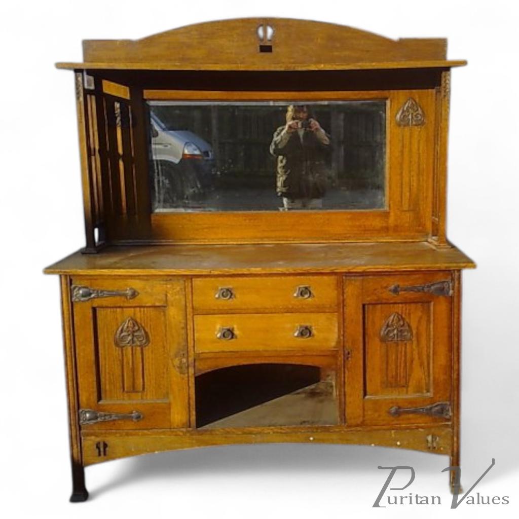 A Glasgow-Style Arts and Crafts oak sideboard with stylised cut-outs to the top and sweeping base. A bevelled mirror back and wonderful carved details to the upper section and the doors with copper strap hinges and 2 drawers above an open display area.