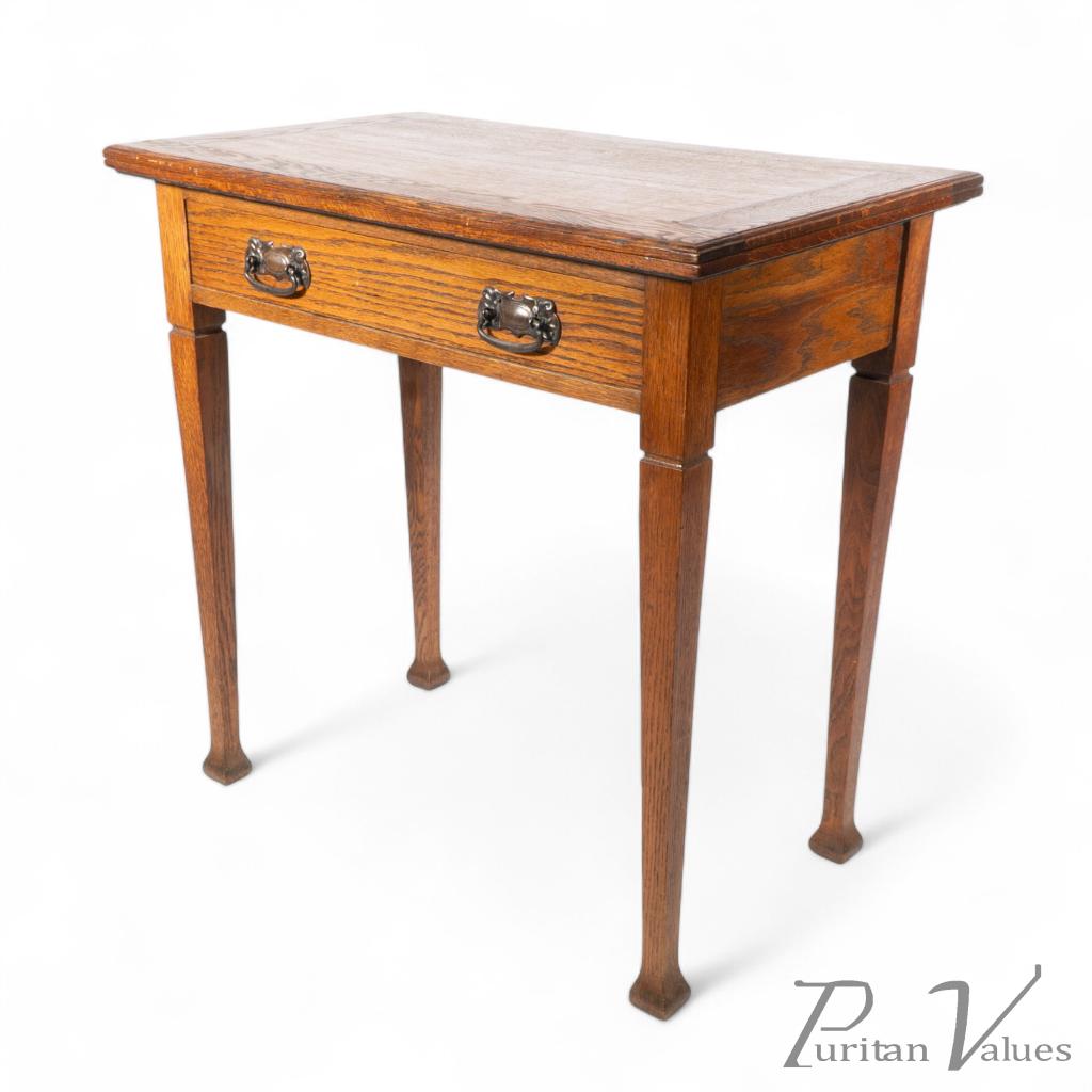 This oak table, produced during the Arts and Crafts movement c.1900, was designed for domestic use as a card or games table, its balanced construction typical of the period. The rectangular top is supported on chamfered, tapering legs joined by a plain apron enclosing a single drawer with stylised copper handles.