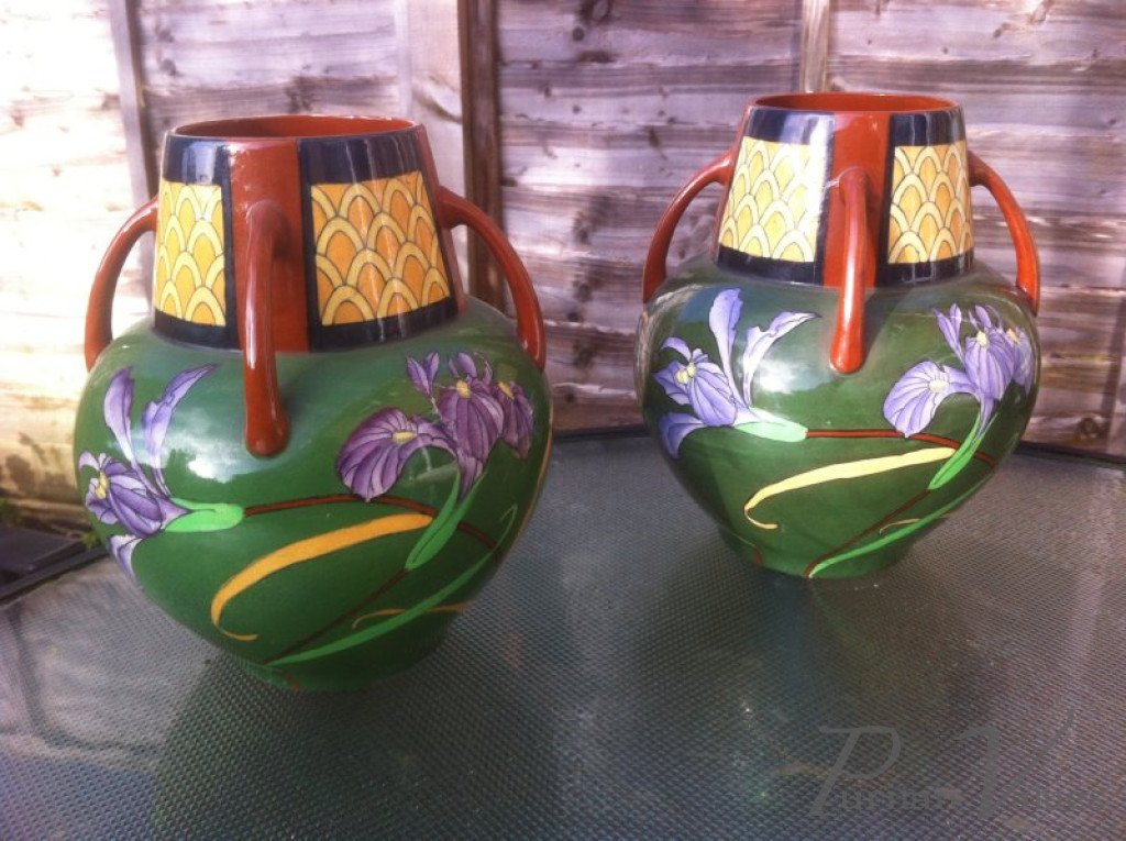A good rare pair of Foley Intarsio vases, hand decorated with vivid swirling Iris's on a rich green back ground. The shape is rare and in the true Arts and Crafts style with four stylised handles to the top. One has a very small firing mark. Height 8 3/4", Width 7 1/2". Reg Design Number 330282 dates this pair at Circa 1899.