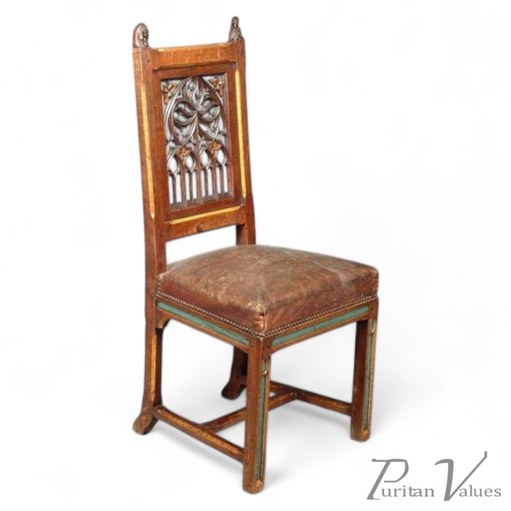 A Gothic Revival painted, carved and pierced oak side chair, possibly designed by William Burgess