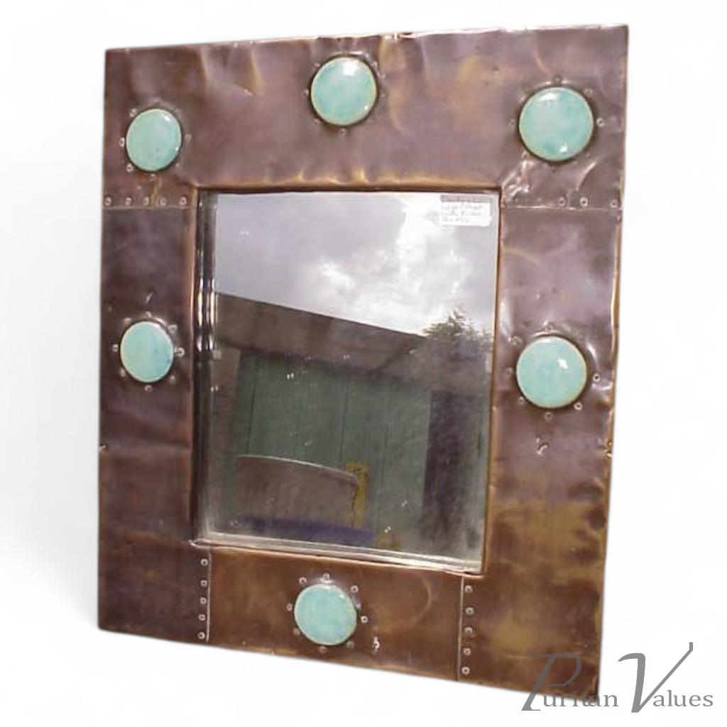 A large Arts and Crafts copper mirror with six large Ruskin roundel's. Height 19", Width 16". Circa 1900.