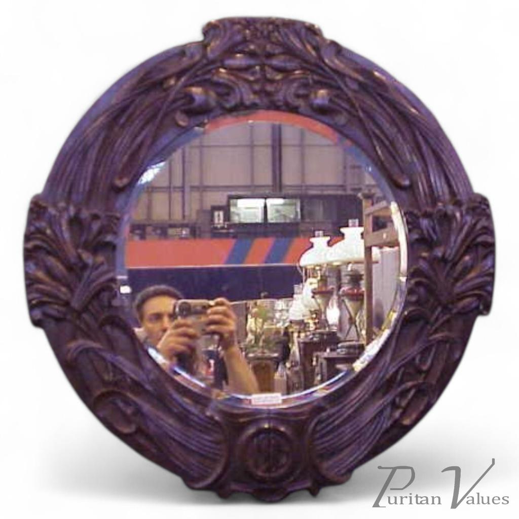 A large Arts and Crafts oak mirror with floral carving of superior craftsmanship.