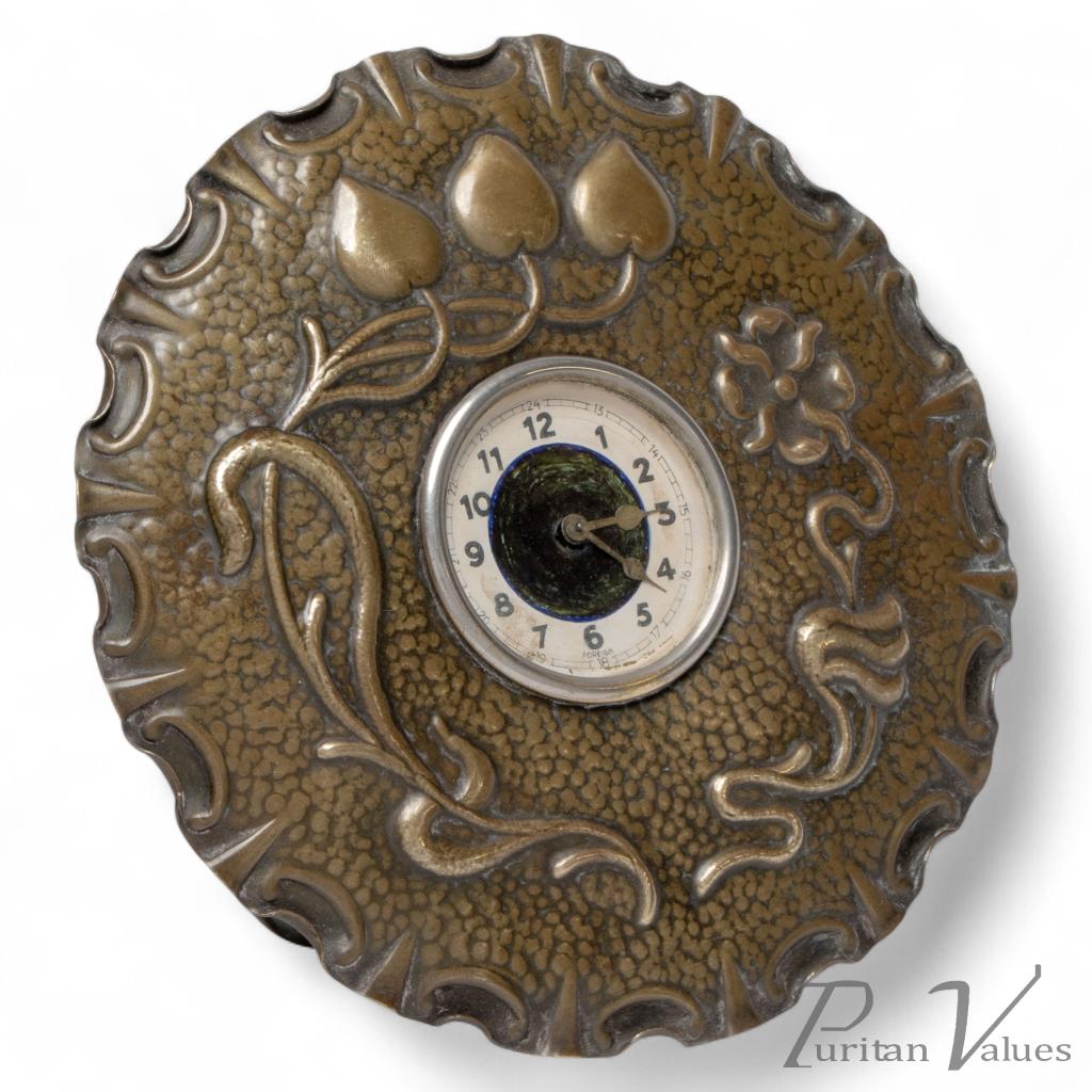 In the shape of a flower head, this clock features hand hammered floral decoration. It retains the original simple clock movement, which ticks away sweetly.