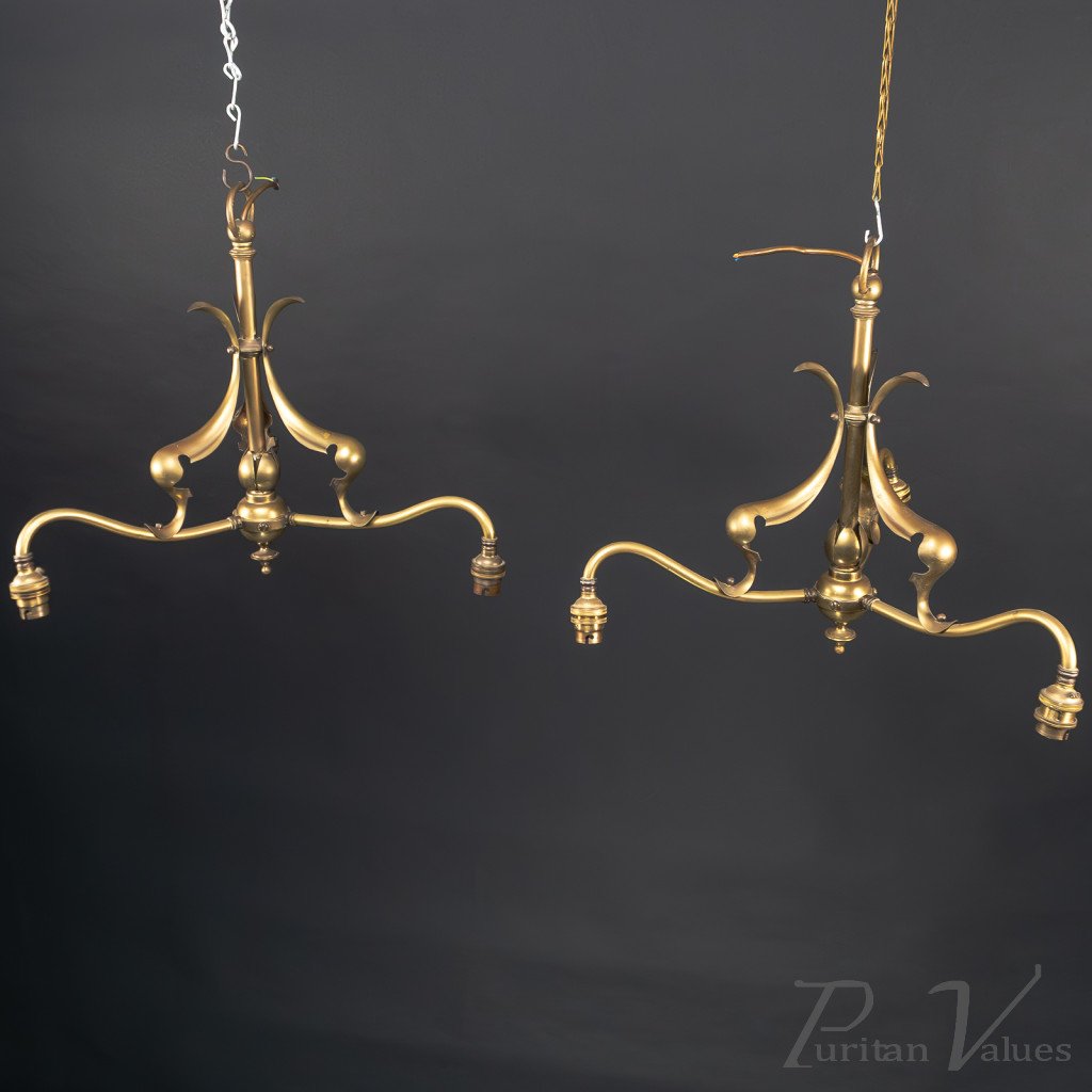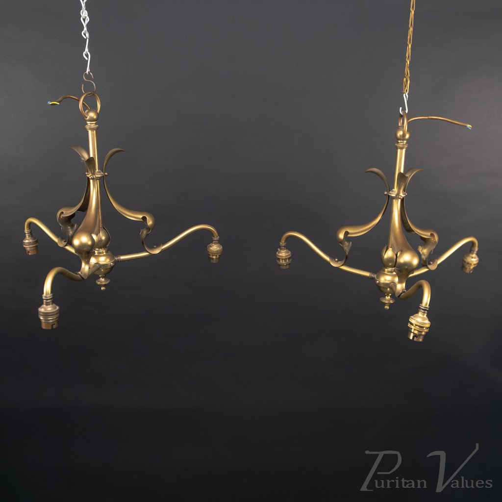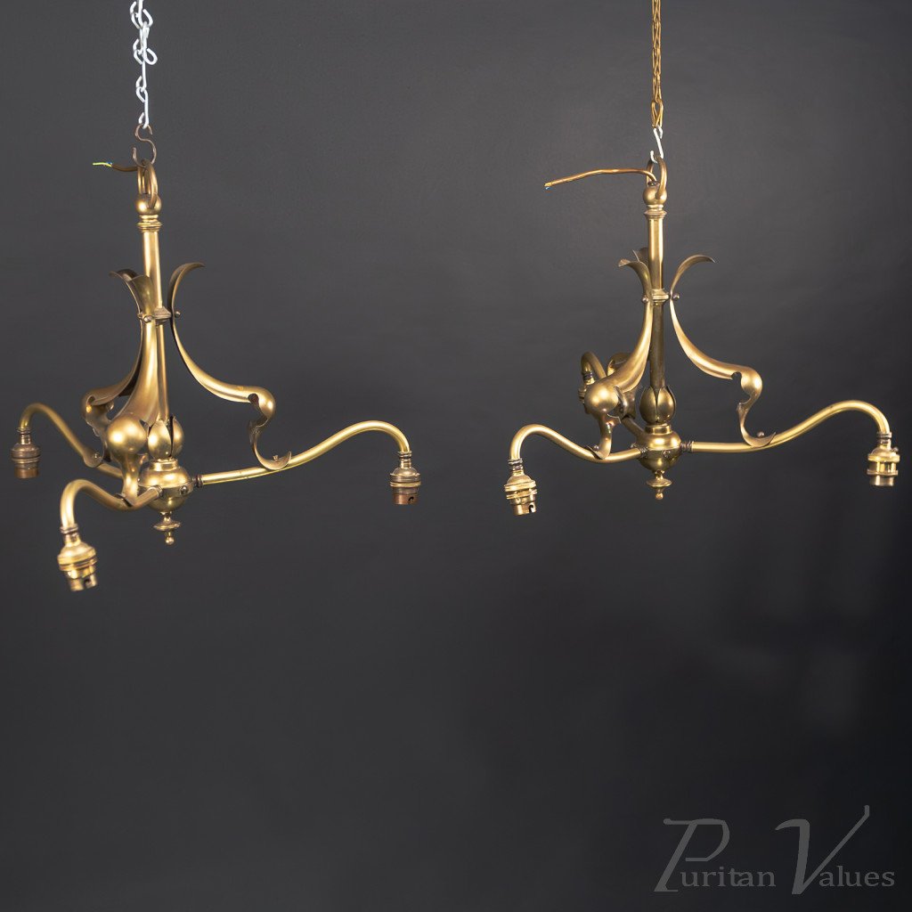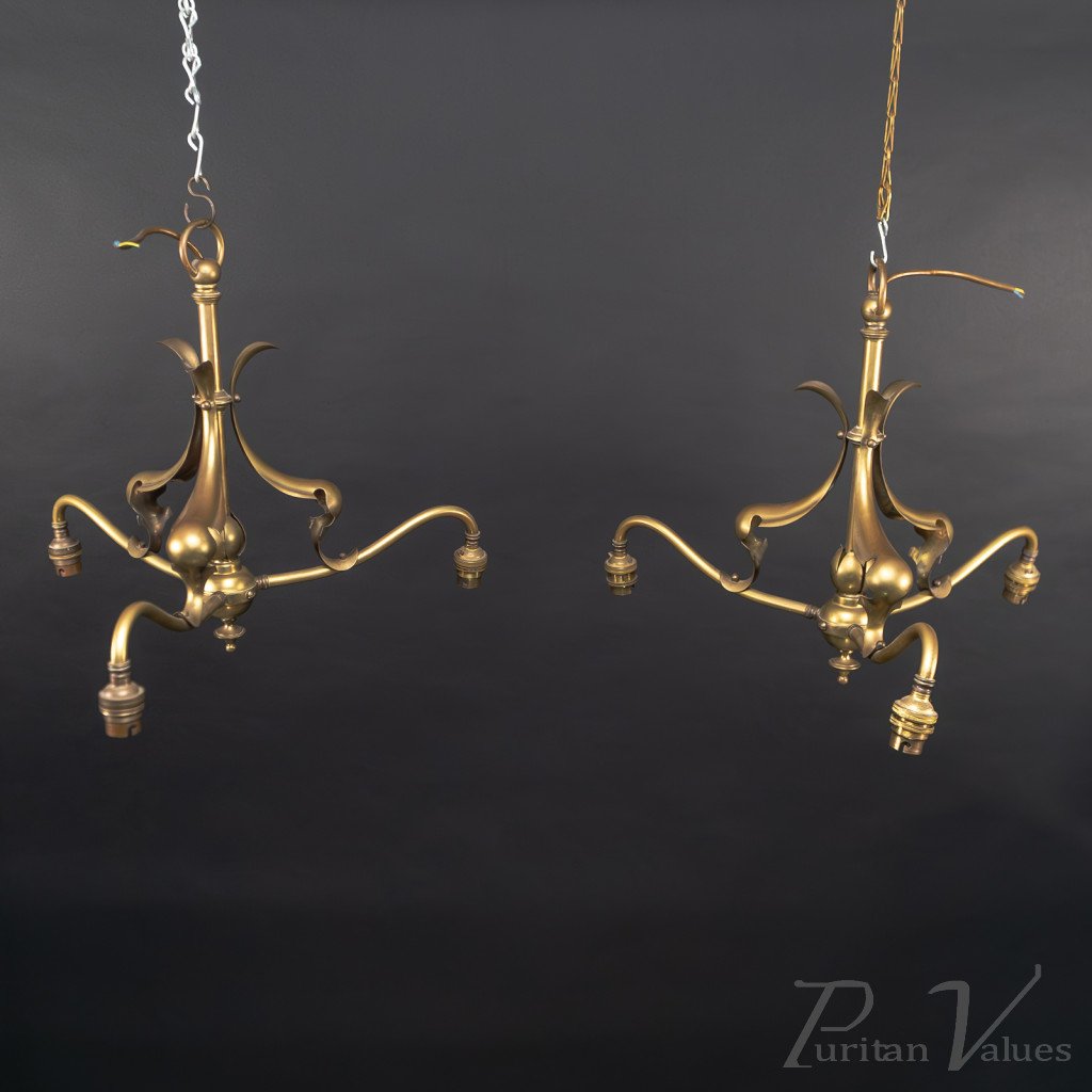 Arts and Crafts – Pair of Brass Three-Branch Ceiling Lights, c.1900