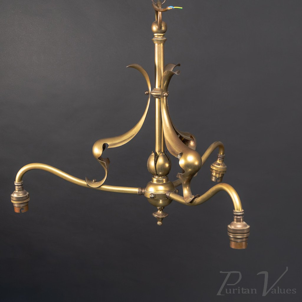 An Arts and Crafts pair of ceiling lights in brass, aligned to the Arts and Crafts movement (1880–1910), c.1900. Each fitting has a central stem with turned knops, three sweeping scroll arms, and pendant lamp holders. A baluster hub and small finials give gentle emphasis without heavy ornament. The forms read light and elegant, suitable for hallways, dining rooms, or a paired installation across a larger space. Sold as a set of two.