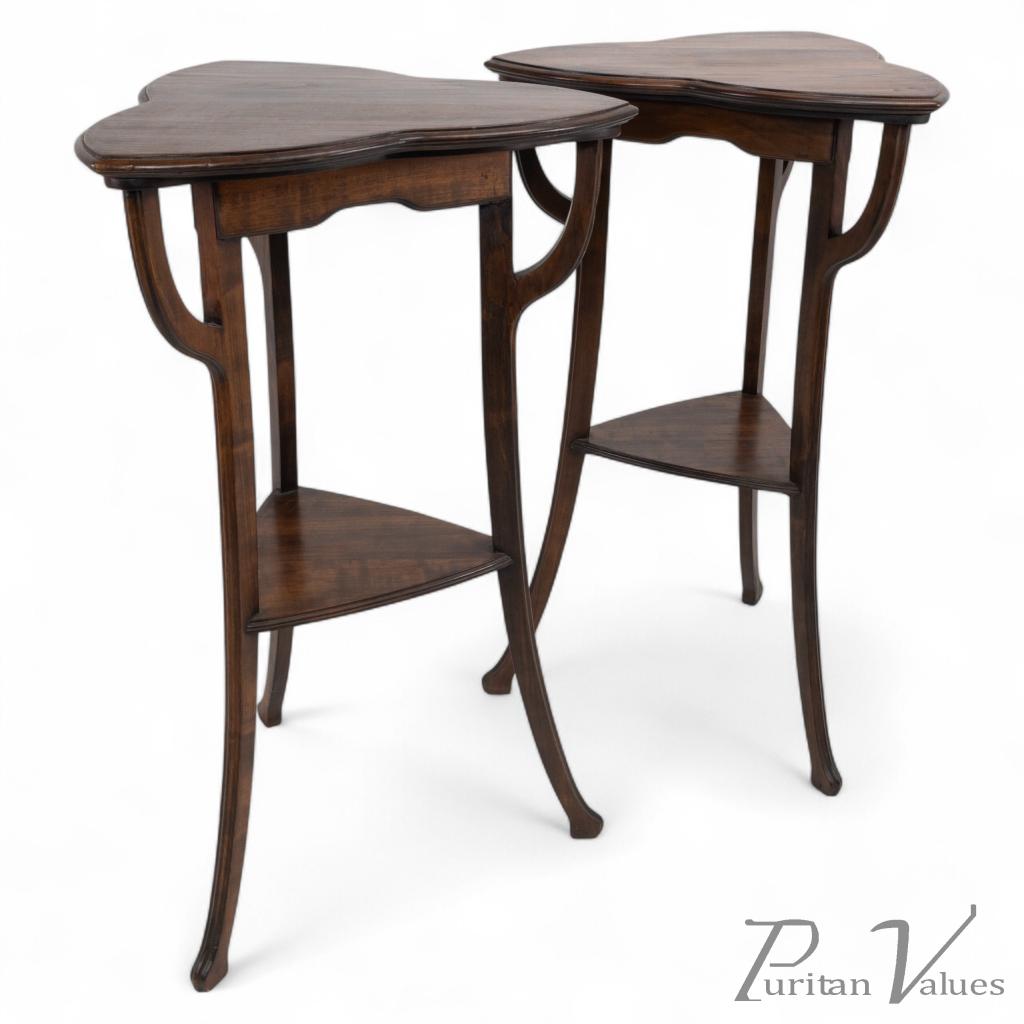 These tables feature clover leaf style tops supported by whiplash uprights beside shaped aprons. They flow with elegant legs finishing on little pad feet, united by a lower triangular shelf. Subtle astragal moulded edges throughout bring the design even together.
