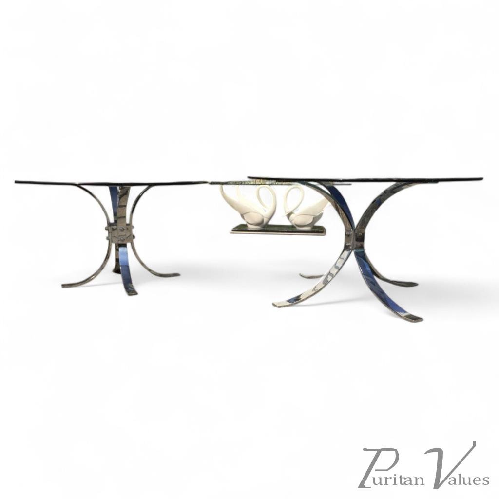 A pair of chrome and glass side tables, Modernist, attributed to Knut Hesterberg, 1970. Each with sculptural tripod base in heavy-gauge chrome.
