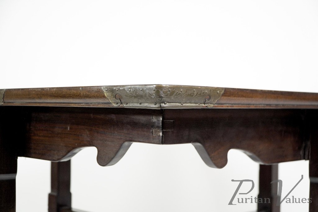 A rare late 19th-century Japanese export square dining table with four matching corner chairs that stow nicely away underneath. The base with four outer legs and a central leg is united by a high shaped cross stretcher. The four corner chairs with shaped backs and four legs are also united by cross stretchers. The table and chairs all have applied decorative brass plaques. The brass plaques are in the Aesthetic taste, engraved with birds amongst stylized floral decoration with stylized frogs below and various Japanese devices. With later cushions. The measurements in the listing are for the chairs. The table measures:-
