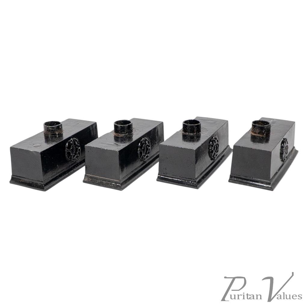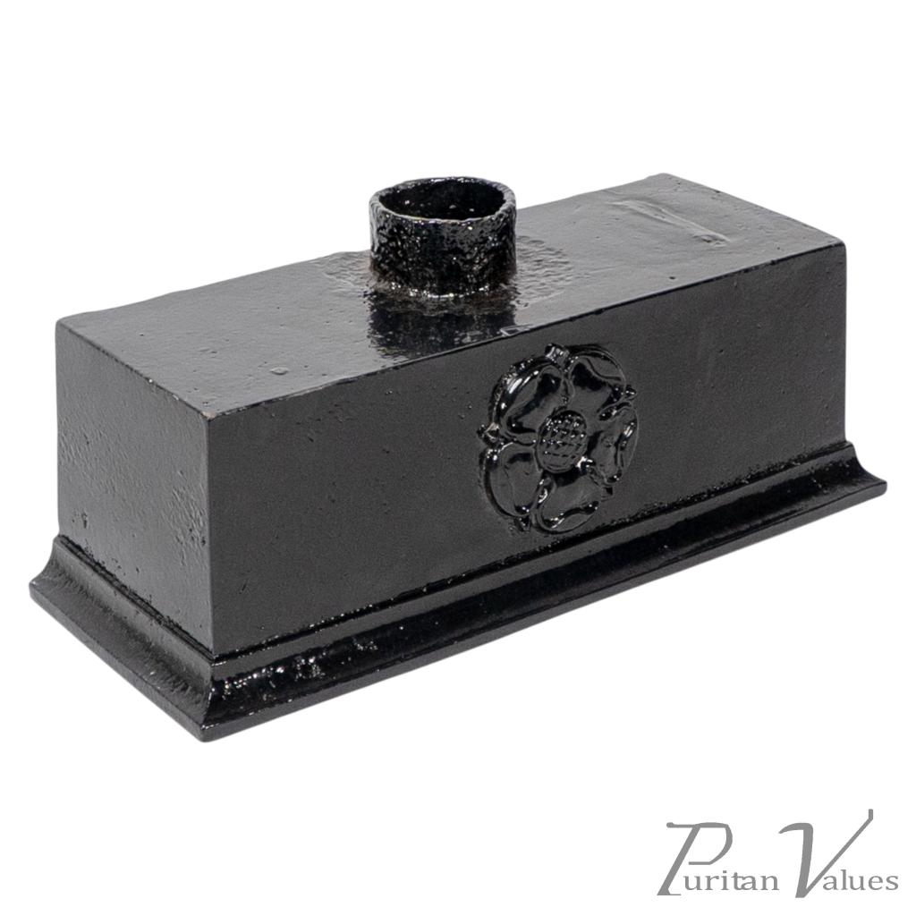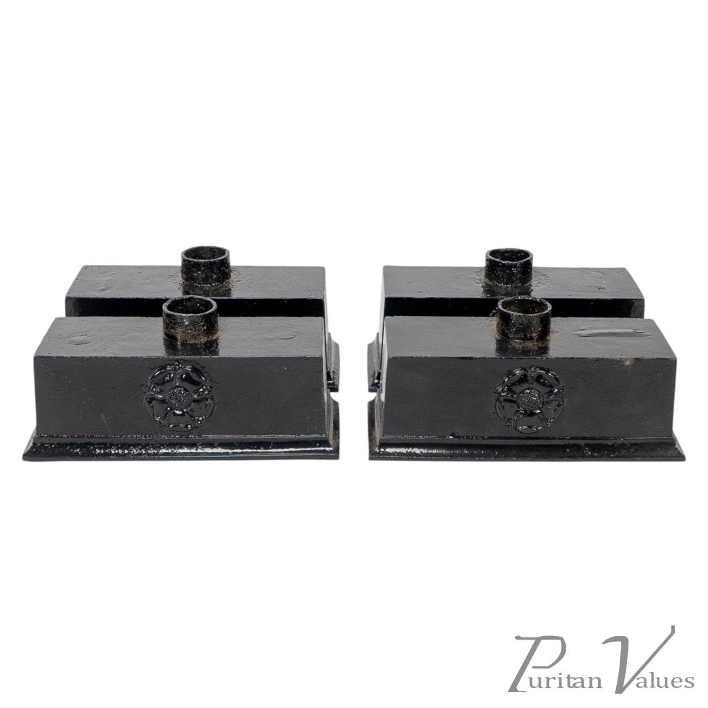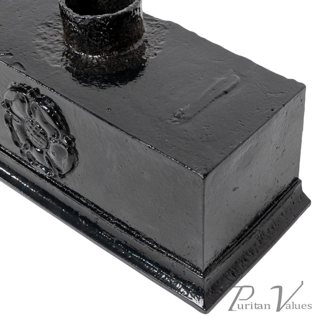 A set of four Arts and Crafts cast iron rain hoppers, each with a raised Tudor rose motif to the front. Recently bead-blasted and finished with a weather-resistant black powder coat for outside use.