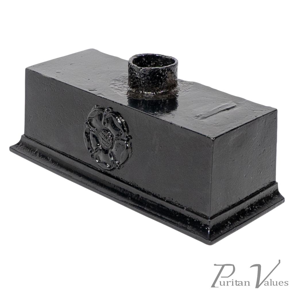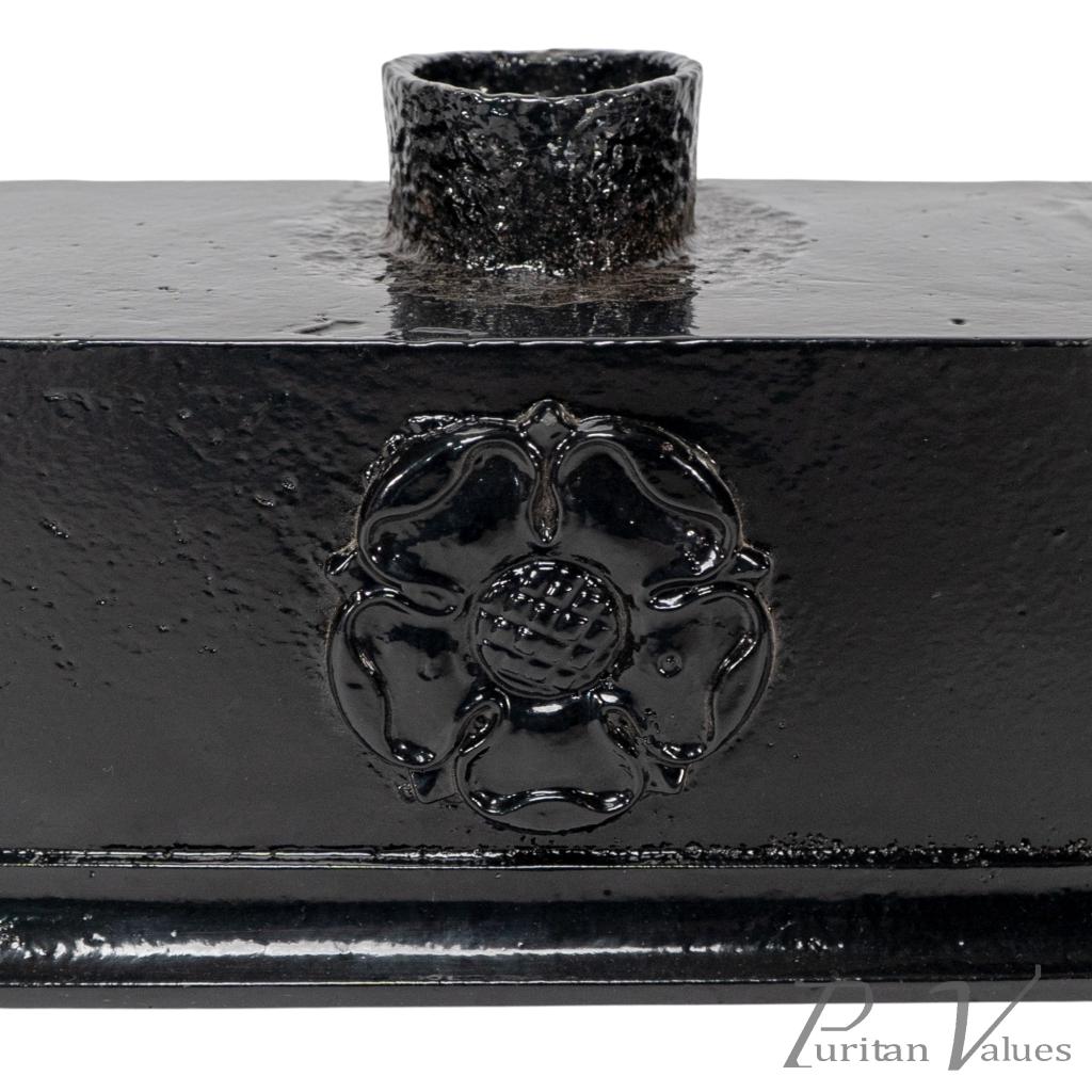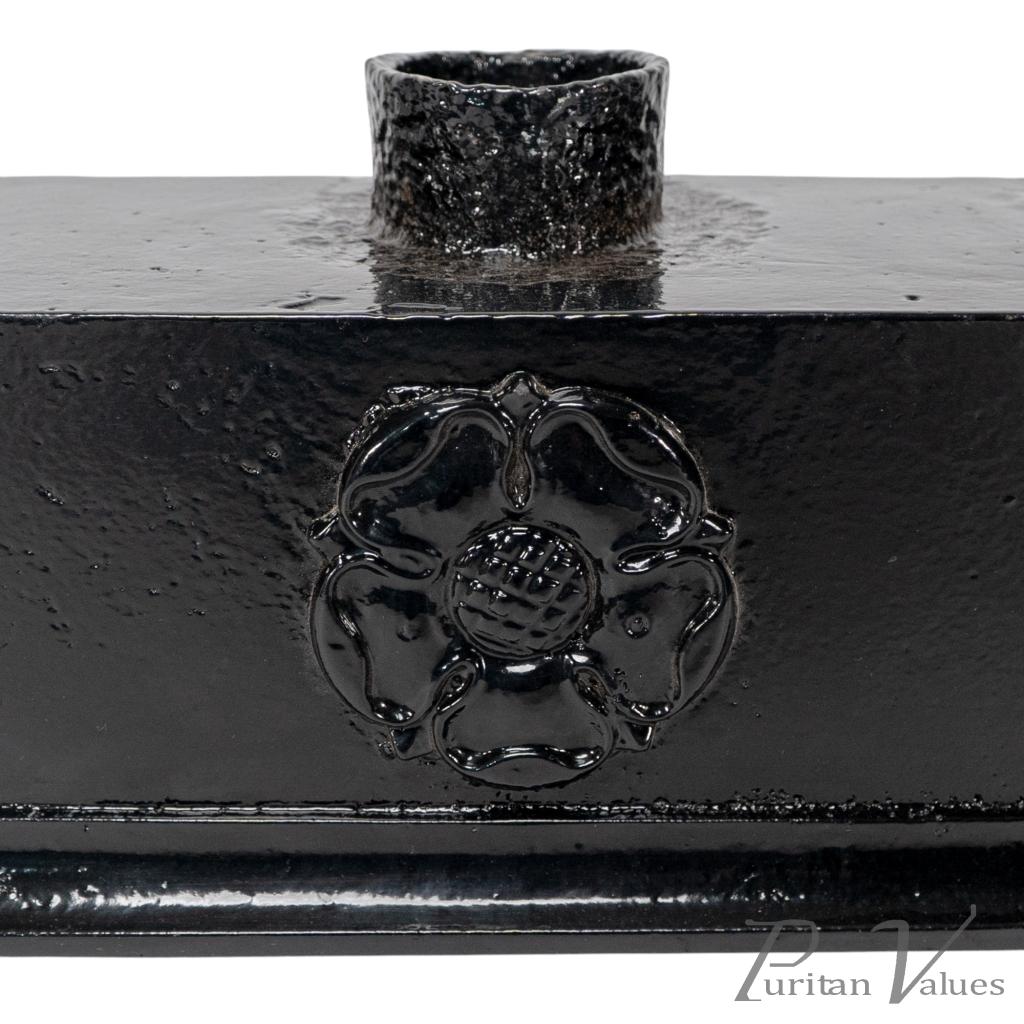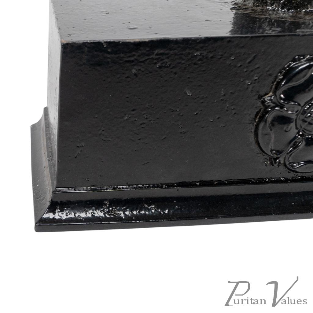 A set of four Arts and Crafts cast iron rain hoppers, each with a raised Tudor rose motif to the front. Recently bead-blasted and finished with a weather-resistant black powder coat for outside use.
