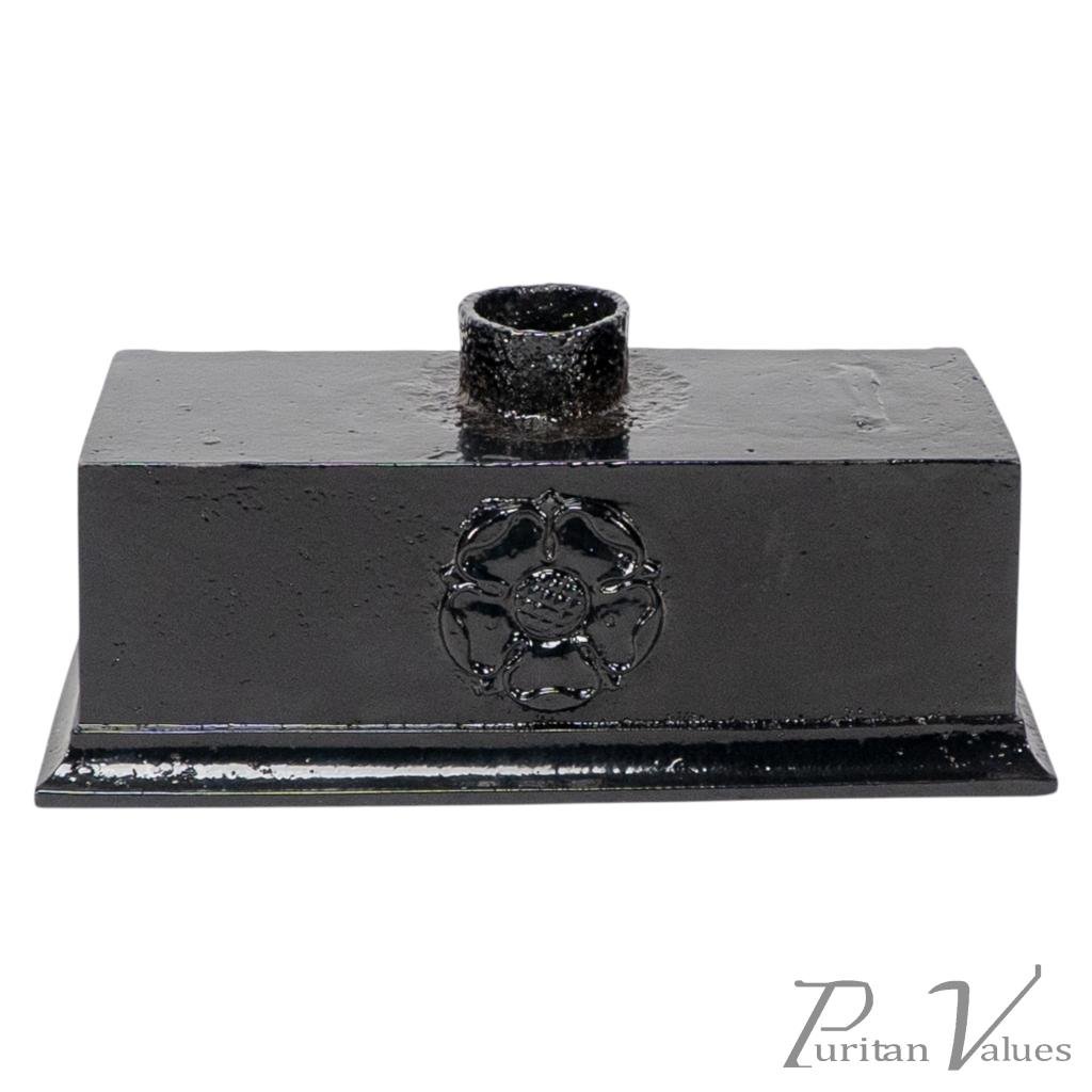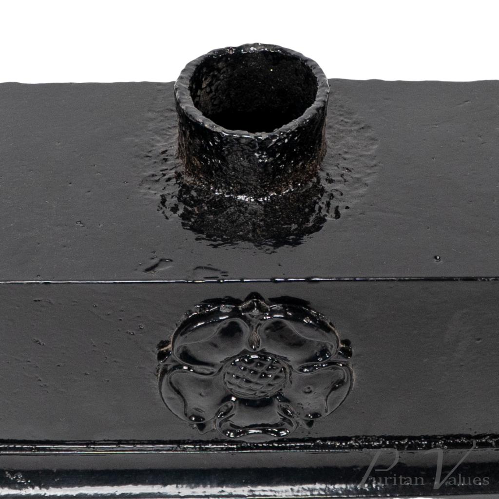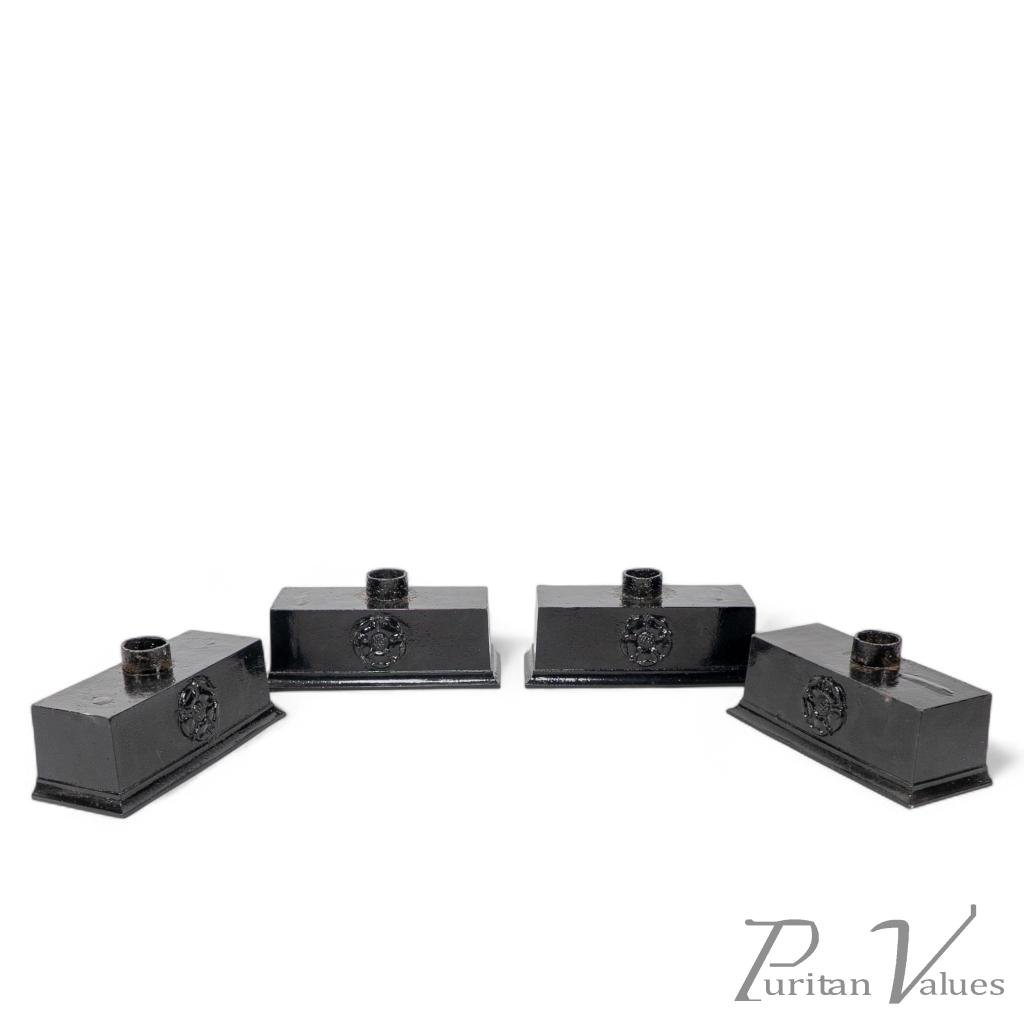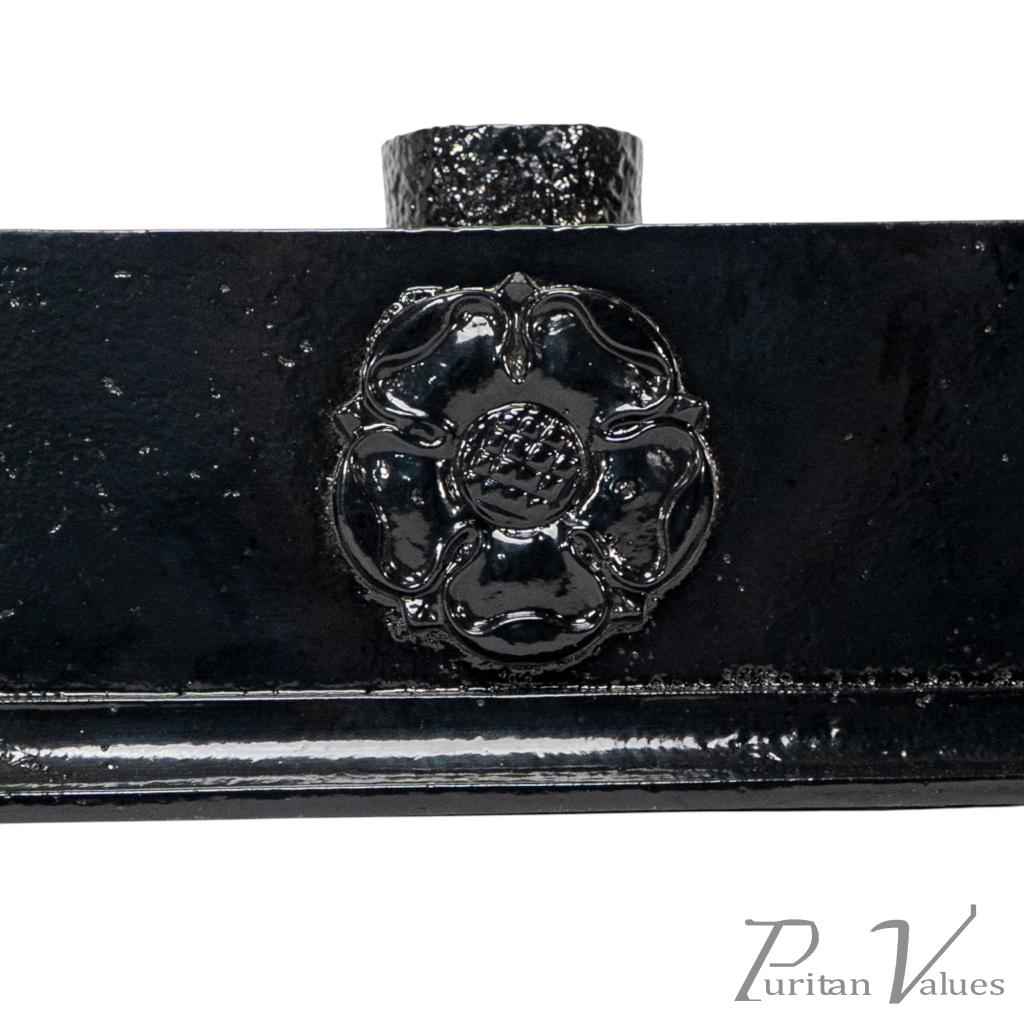 A set of four Arts and Crafts cast iron rain hoppers, each with a raised Tudor rose motif to the front. Recently bead-blasted and finished with a weather-resistant black powder coat for outside use.