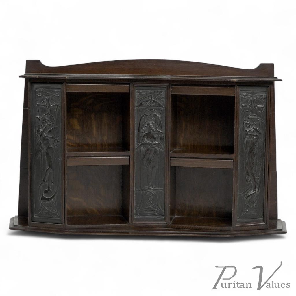 Arts & Crafts Oak Desk Top Bookcase with 3 Bronze Art Nouveau Period Plaques
