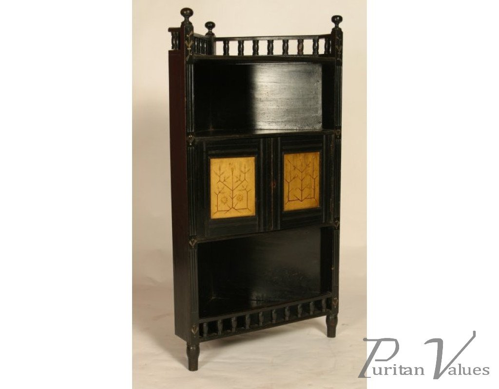 A small ebonised corner cabinet with stylised geometric floral details to the doors. Made by Hindley and Son Height 42", Width at front 22", Depth at sides 19", Depth from centre back to centre front 15". Circa 1875.
