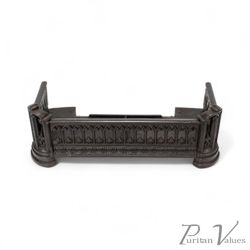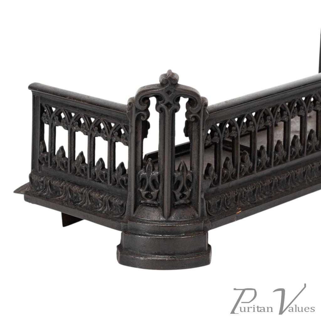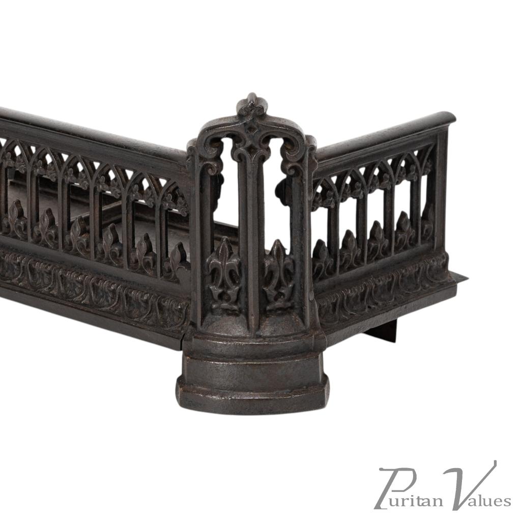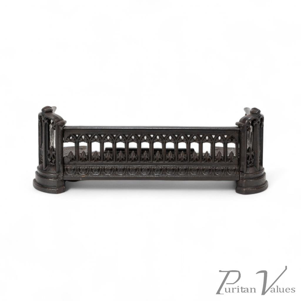 A Small Gothic Revival Cast Iron Fender with pierced trefoil and pointed arch decoration to the front and sides, a row of decorative arches with fleur-de-lys motifs, and a castellated top edge. The corner uprights are shaped like miniature buttresses with cut-out Gothic panels, all set on rounded plinth bases.