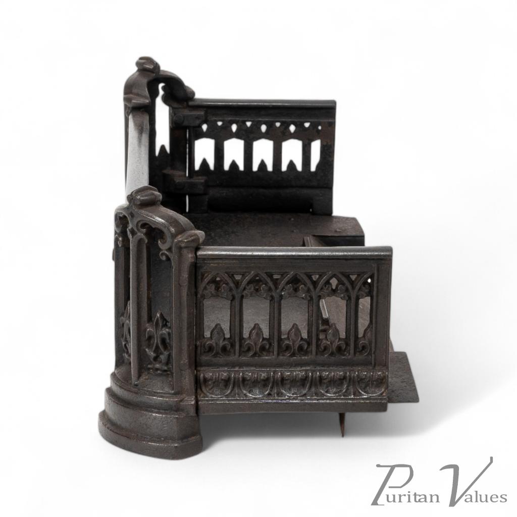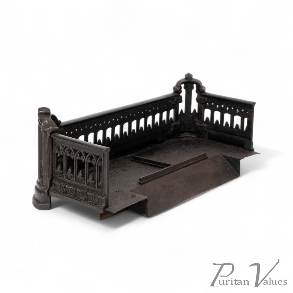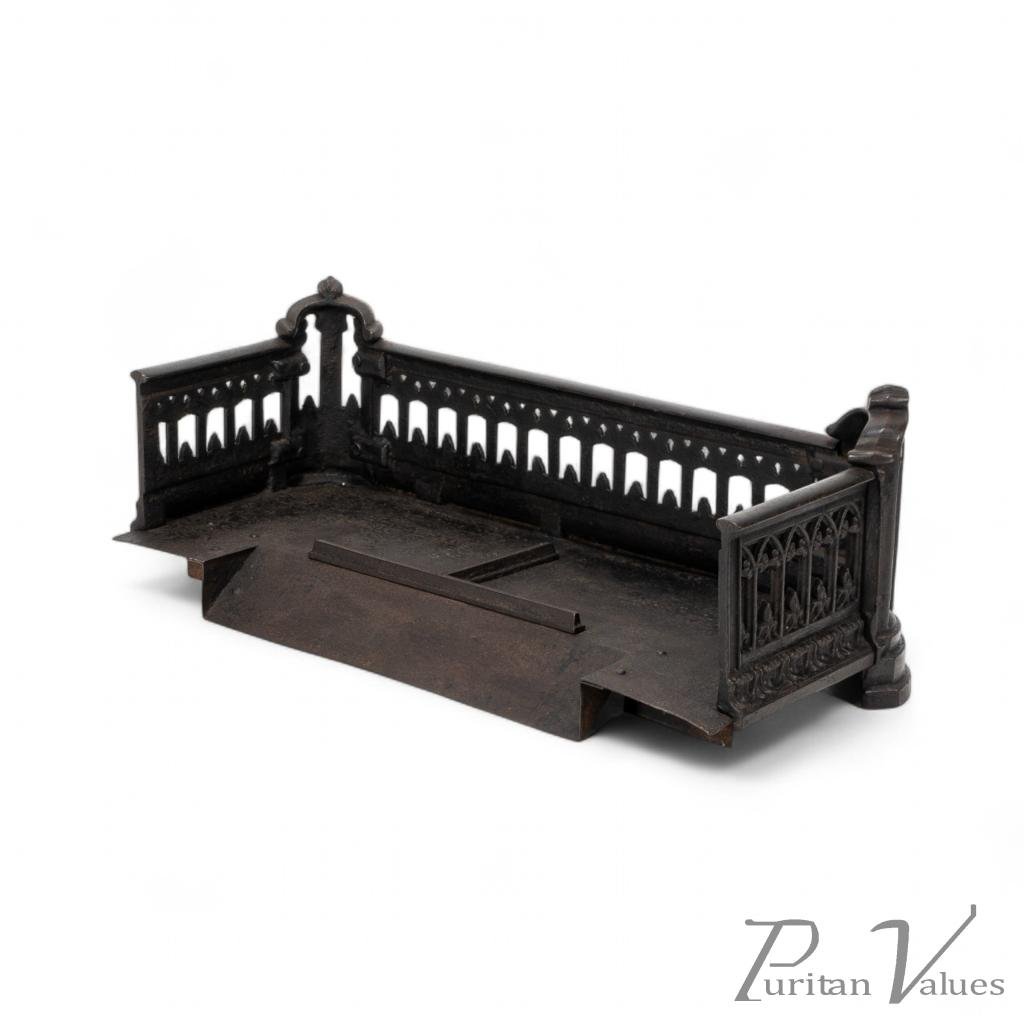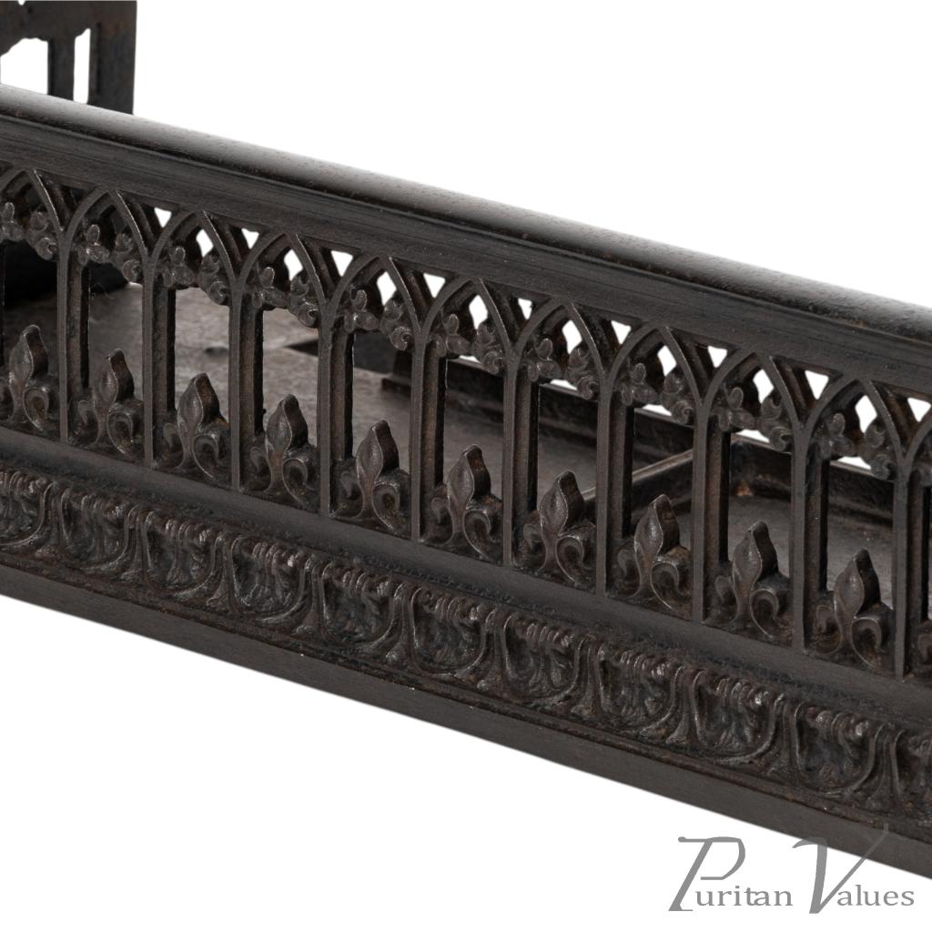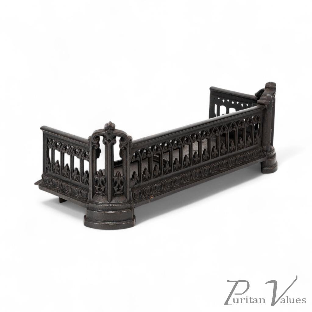 A Small Gothic Revival Cast Iron Fender with pierced trefoil and pointed arch decoration to the front and sides, a row of decorative arches with fleur-de-lys motifs, and a castellated top edge. The corner uprights are shaped like miniature buttresses with cut-out Gothic panels, all set on rounded plinth bases.