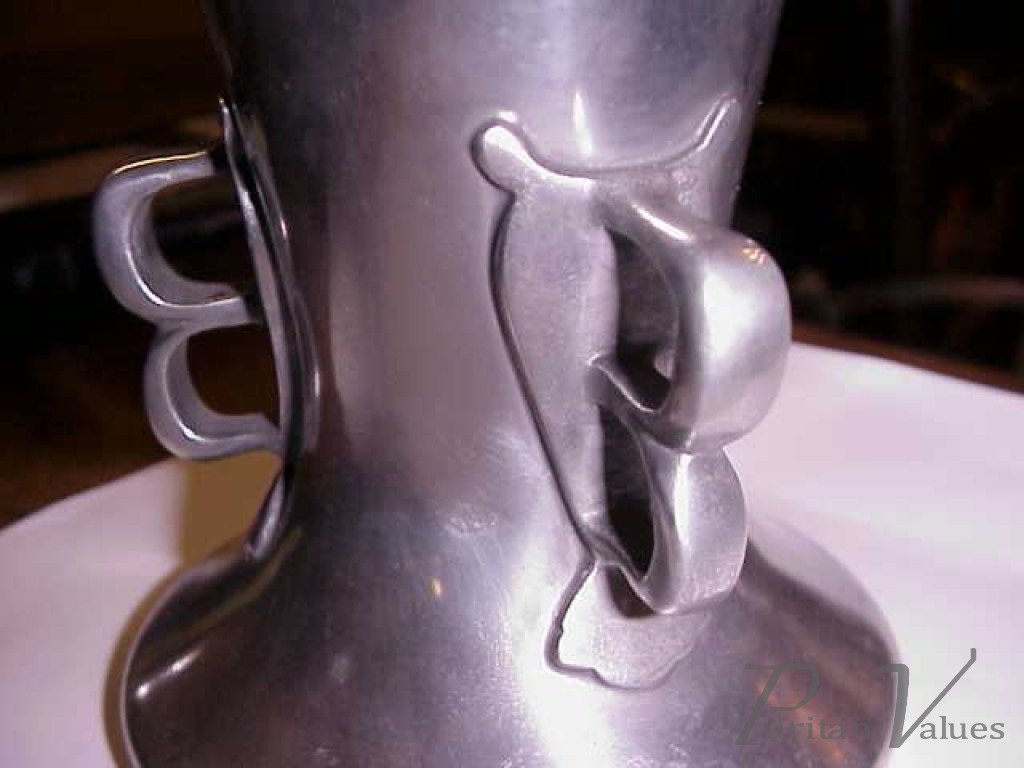 A superb Tudric conical vase with wonderful Turquoise stones on three sides and three double loop handles. Stamped 'Tudric 038'. Circa 1903. Height 7 1/2", 4" across the top.