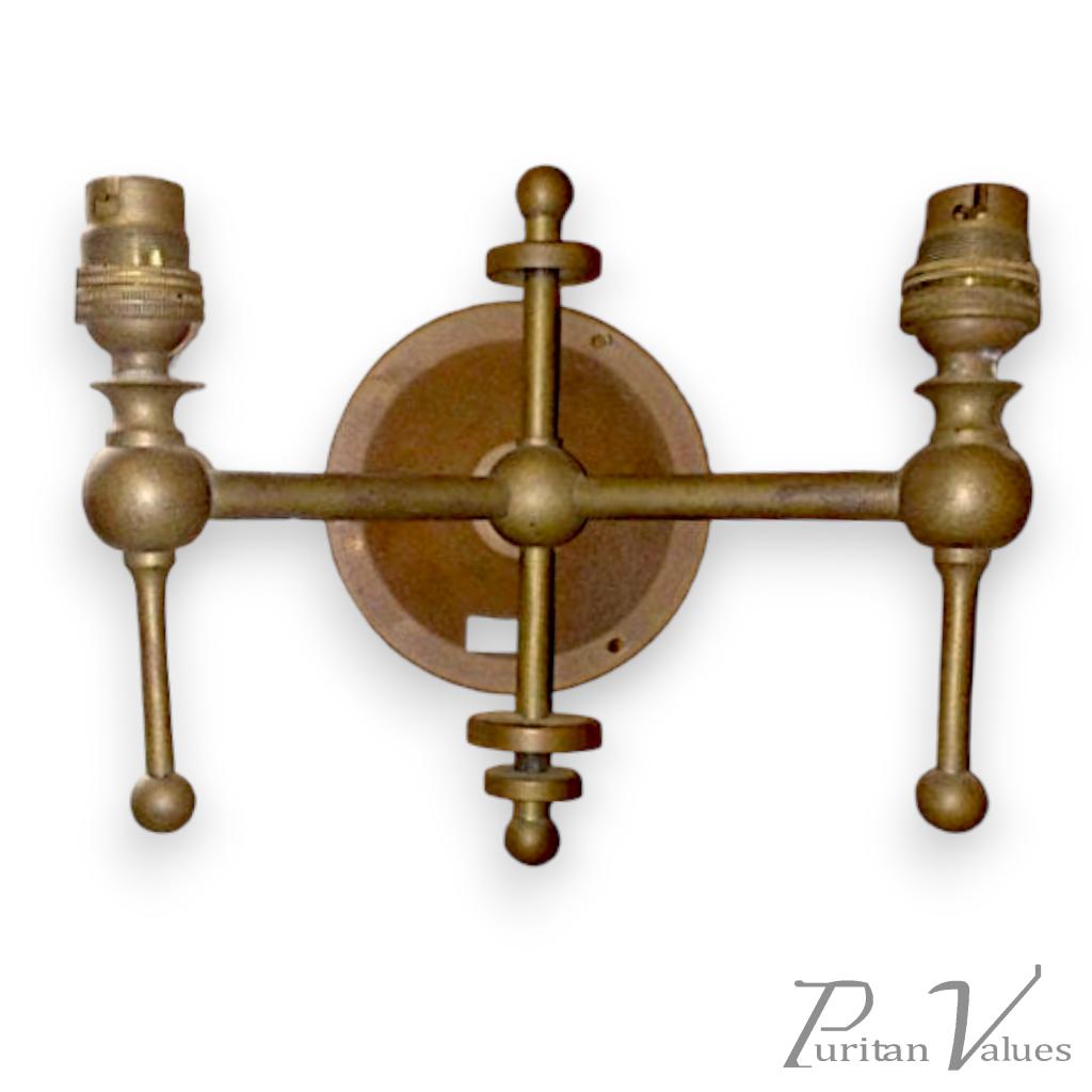 A twin arm single wall light in brass, Arts and Crafts movement, c.1910, with circular backplate 4½" and reach from wall 15¾", reflecting functional balance.