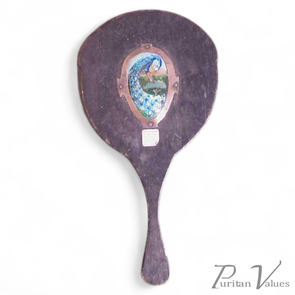 A vanity mirror with an enamelled stylised Peacock to the back and an enamelled letter amongst green heart shaped leaves. Length 12 3/4", Width 6 3/4". Circa 1895.