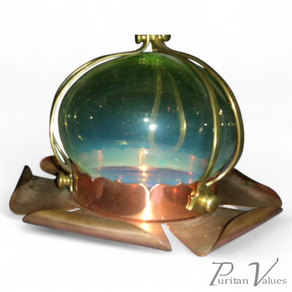G.E.C. The Malvern. A Vaseline shade encased in a brass hanging fixing, with metal petal shaped features. I do have the original hanging chains and flat rods. Measurements: H 7" (not hanging) W 10"