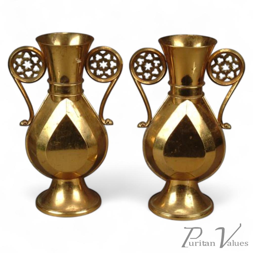 A pair of Gothic Revival brass flower vases designed by A.W.N. Pugin with stylised pieced handles and engraved 'St Mary's Parish' to the base. Measurements Height 14", Width across handles 8". Circa 1895.