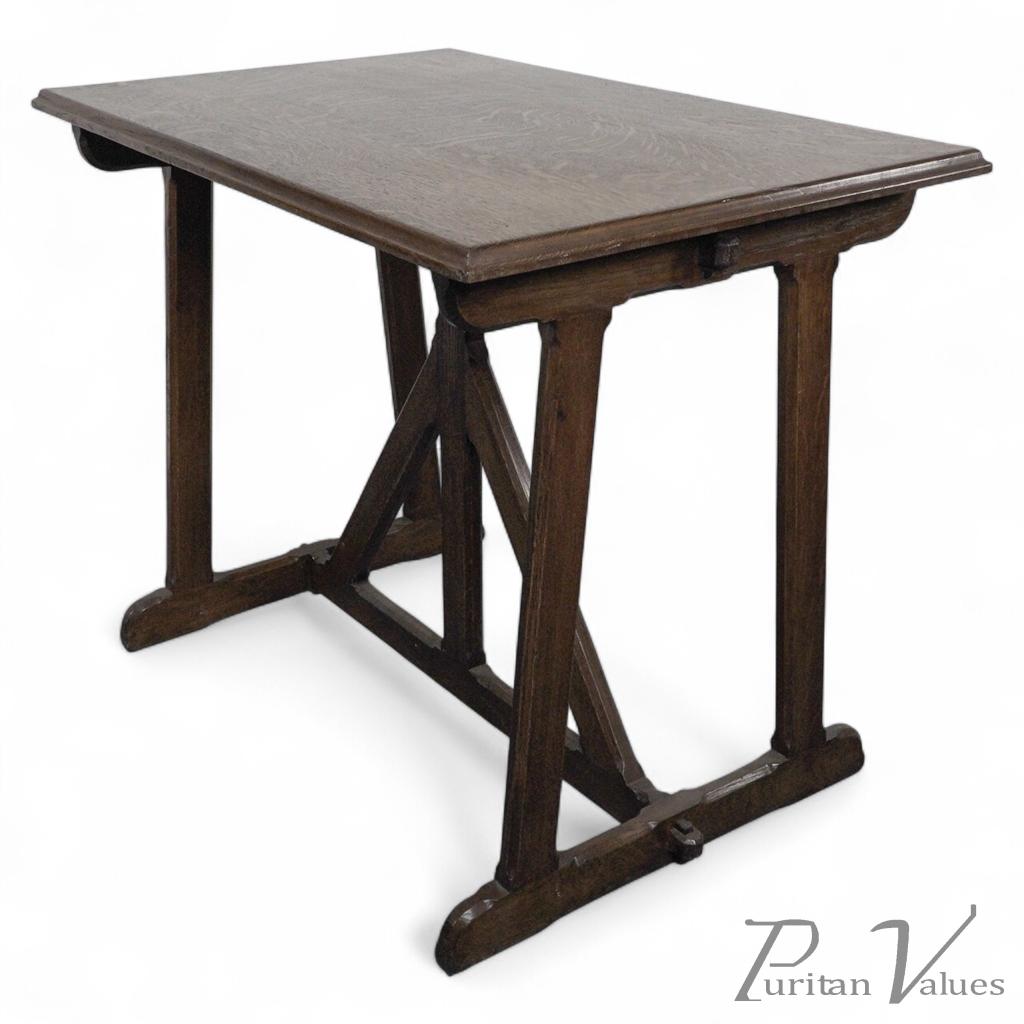 A late 20th Century Gothic Revival oak table. Of the type that A. W. N. Pugin instructed was for "poor vicars". He asked the furniture-maker John Gregory Crace to keep it in stock for them, so they could be easily self-assembled.