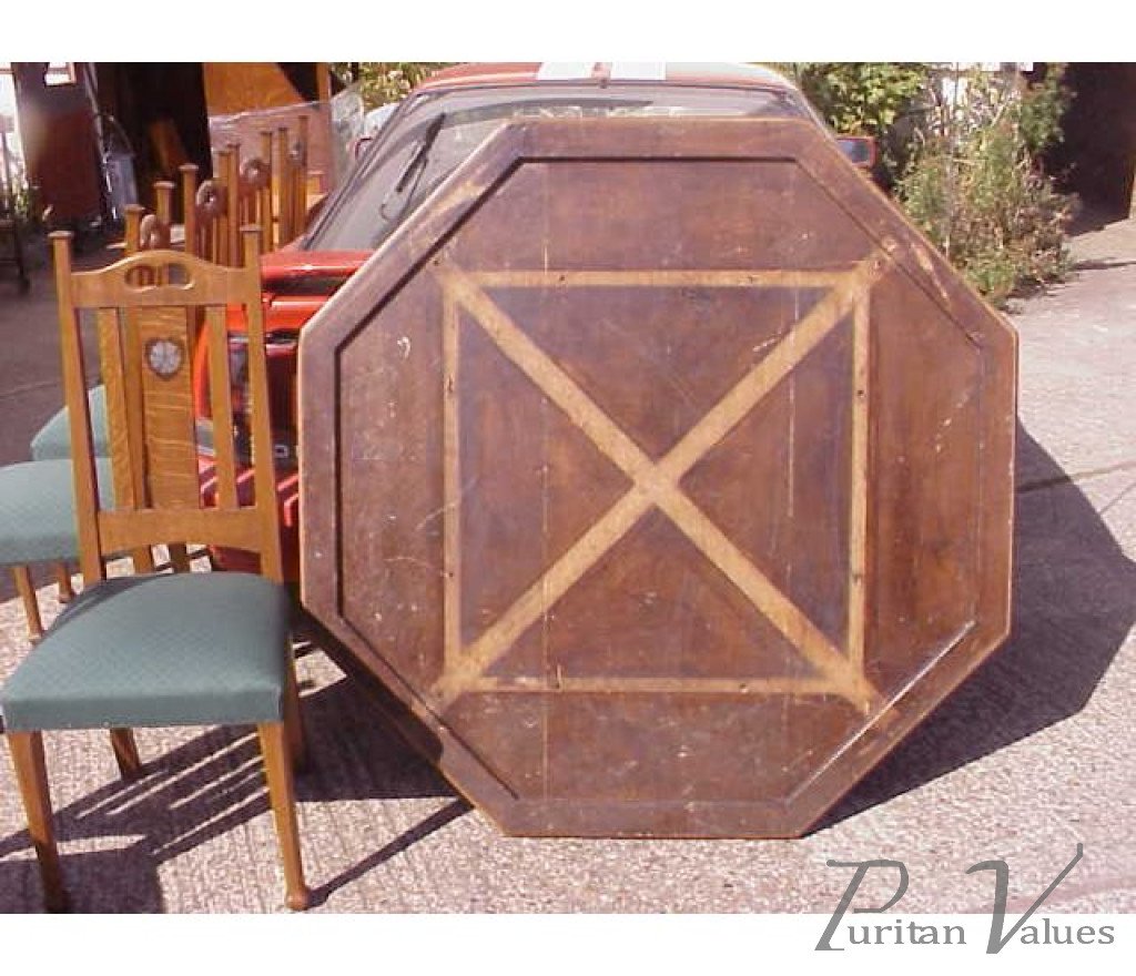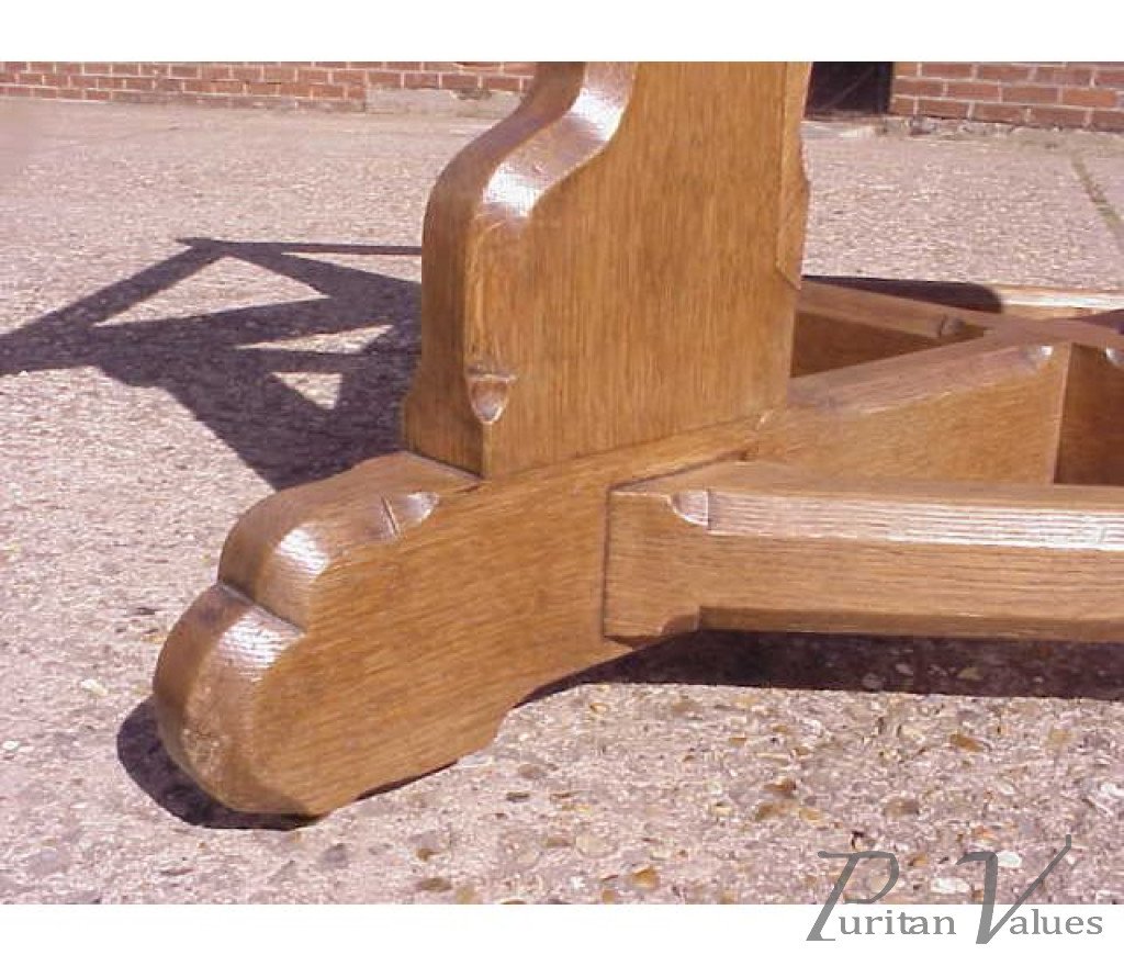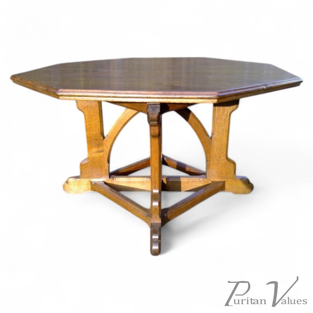A.W.N.Pugin. An outstanding oak centre table designed by Augustus Welby Pugin and almost certainly made by firm John Gregory Crace. Height 30 1/2", Width 52", Depth 52". Circa 1847. See The Pictorial Dictionary of British 19th Century Furniture Design, page xxvi for an identicle but carved version designed by Pugin for Abney Hall which is now in The Victoria and Albert Museum. Last 2 Images. Provenance: Another similar table with drawers but the identicle base was sold at Bonhams Chester and also formerly at Abney Hall, Cheadle, Cheshire. Under the patronage of Sir James Watts. A textile wholesaler and Lord Mayor of Manchester, Abney Hall was remodelled as a private home with reception rooms designed and decorated by Pugin and Crace in the 1850's. The decorative scheme was completed in 1857. Prince Albert during a visit to Manchester described the hall as 'a most princely mansion'. Abney hosted many other important people including Edward VII, Disraeli, Gladstone and E.M Forster. The reclusive Agatha Christie visited Abney when it was in the possession of her brother-in-law and wrote two novels there, 'The Tale of the Christmas pudding and After the Funeral'. The hall became known Cheadle Town Hall when it was sold to the local council in 1959. This uncarved version without drawers is actually more true to Pugins later designs which were simpler and less elaborate and in those respects more important because of the purity within Pugins designs in his later years before he became insane and died at only 40 years of age in 1852.