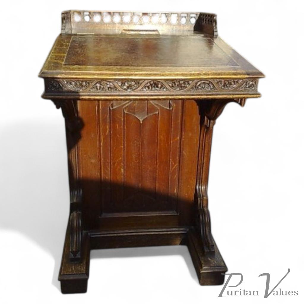 A Gothic Revival oak Davenport in the style of A.W.Pugin. The carving throughout this piece is exceptional, I particularly like the little acorn that has fallen leaving it's empty shell which can be seen in images 17, 18 and 19. The linenfold details are finely executed. The side cupboard door with further Linenfold detail opens to reveal four graduated drawers. Height 36", Depth 27", Width 22 3/4".