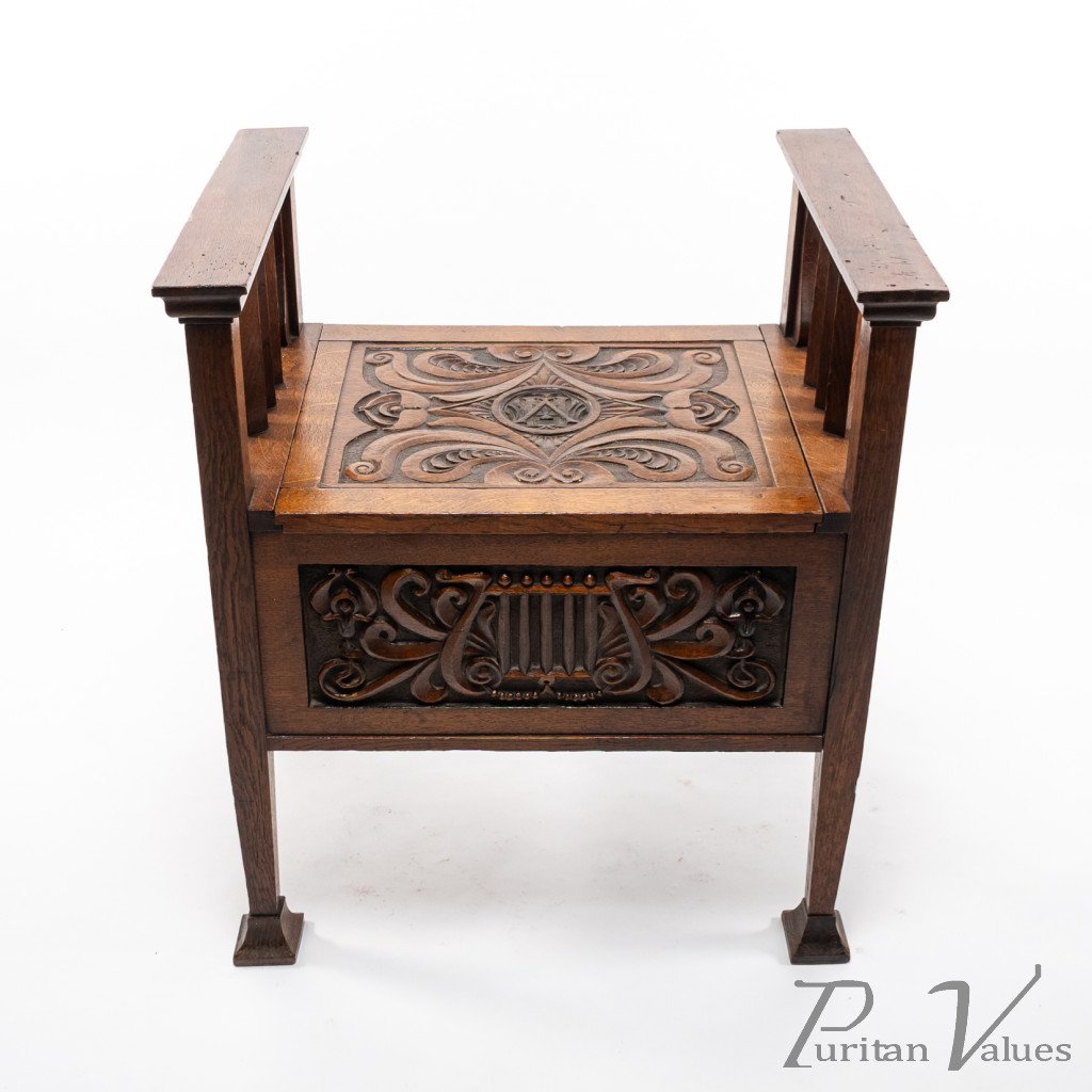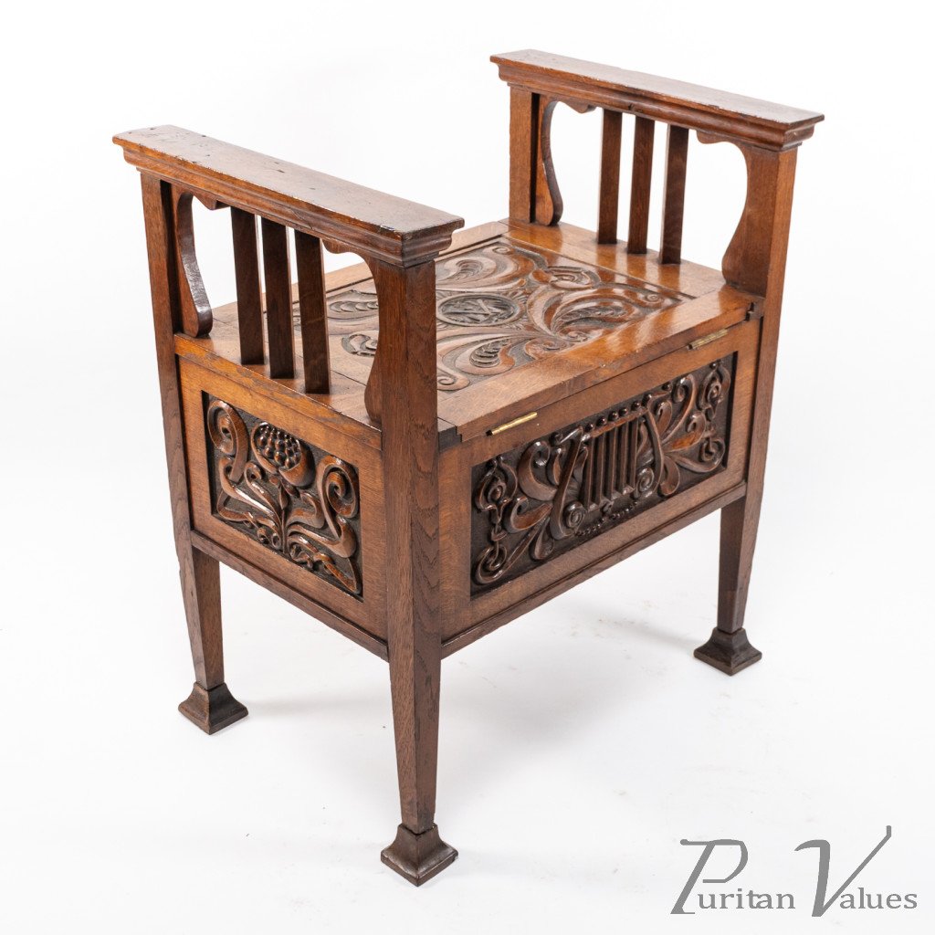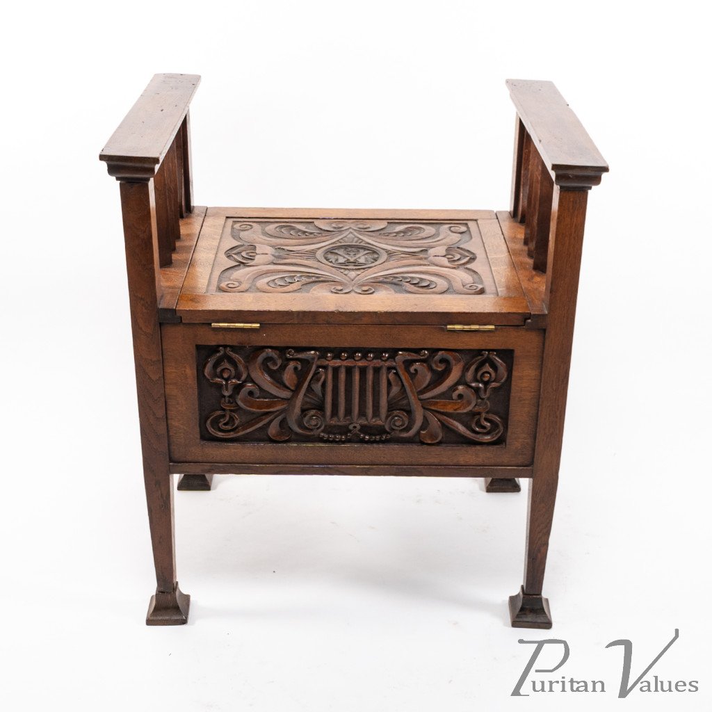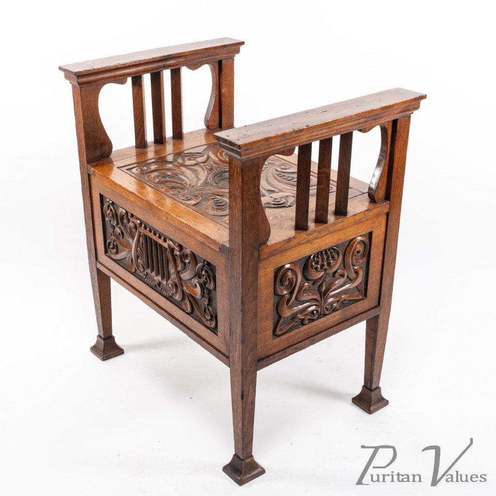 Arts and Crafts oak piano stool with carved floral decoration to the lift-up seat and a large storage area inside. The lower sides are carved with floral decoration, and the lower front and back are carved with a harp amongst foliage. Stood on square tapering legs and square feet.