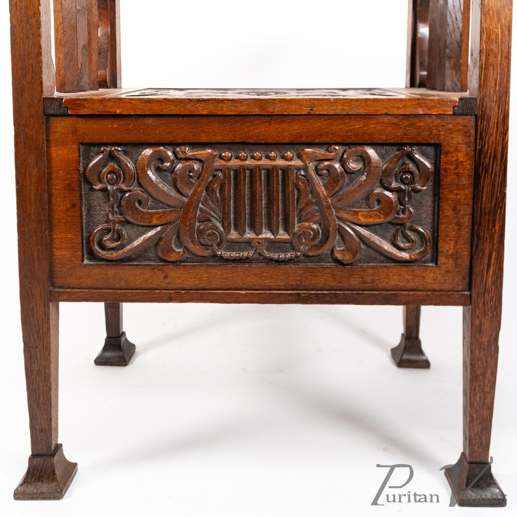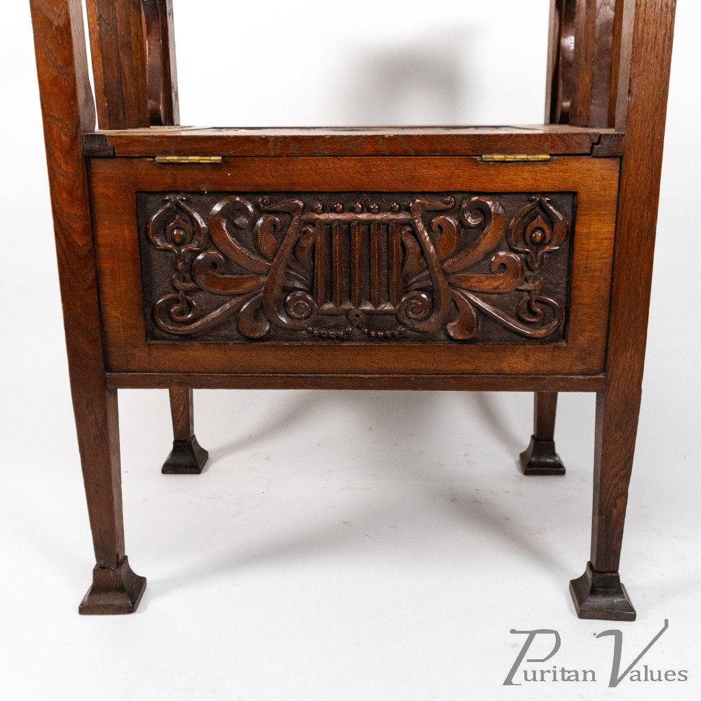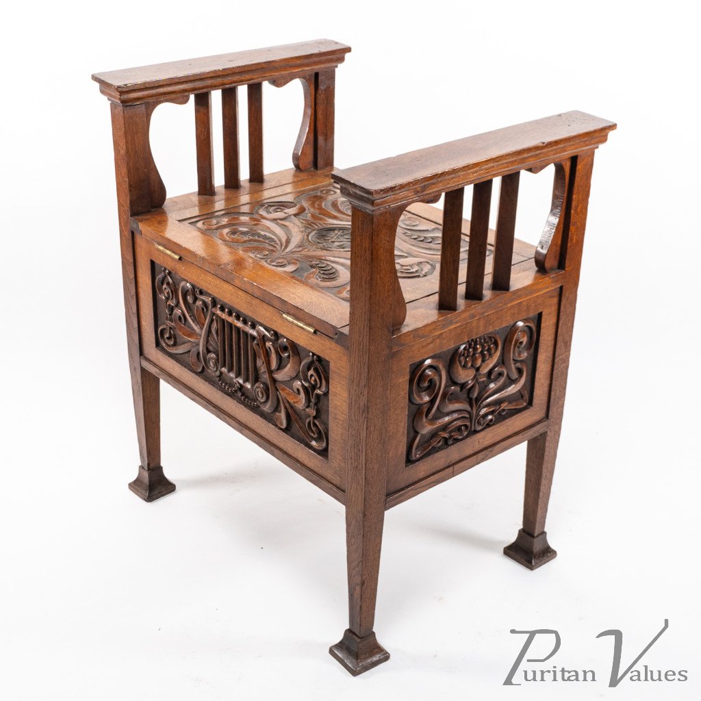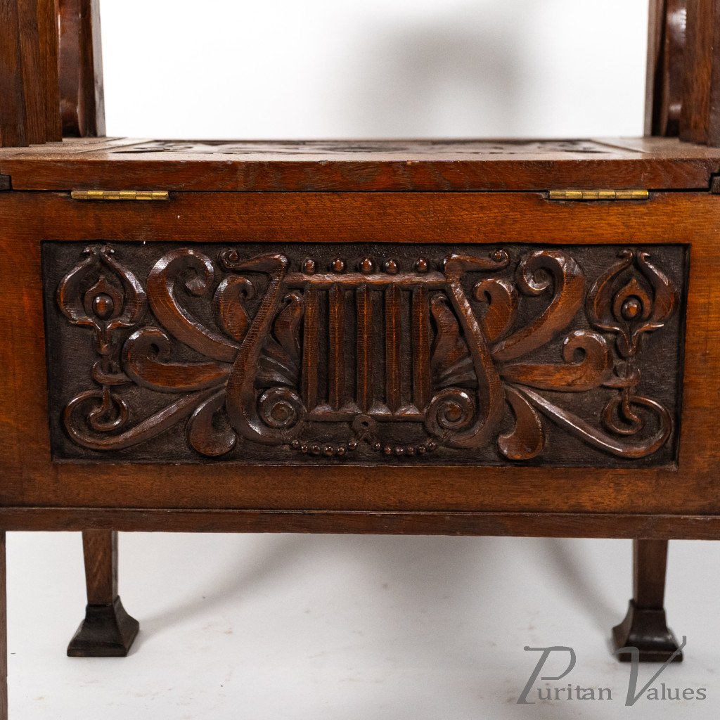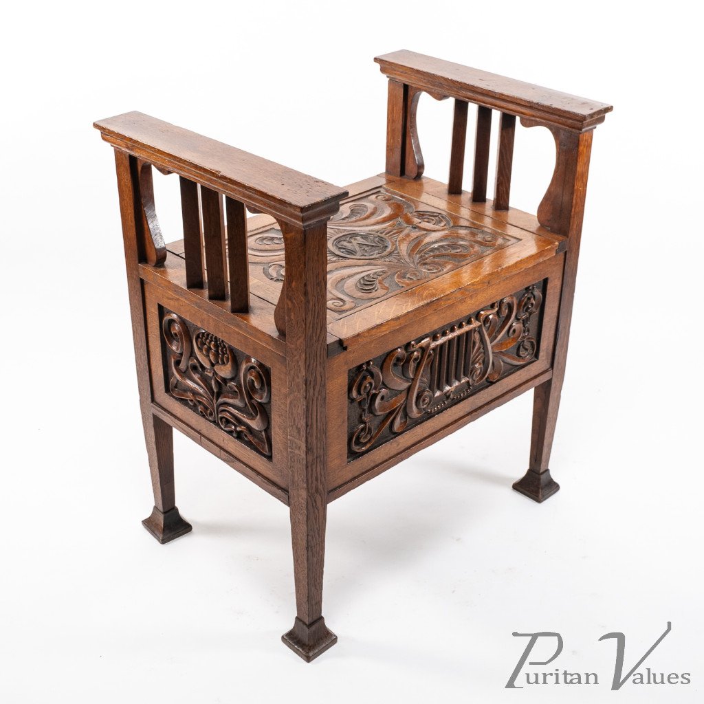 Arts and Crafts oak piano stool with carved floral decoration to the lift-up seat and a large storage area inside. The lower sides are carved with floral decoration, and the lower front and back are carved with a harp amongst foliage. Stood on square tapering legs and square feet.