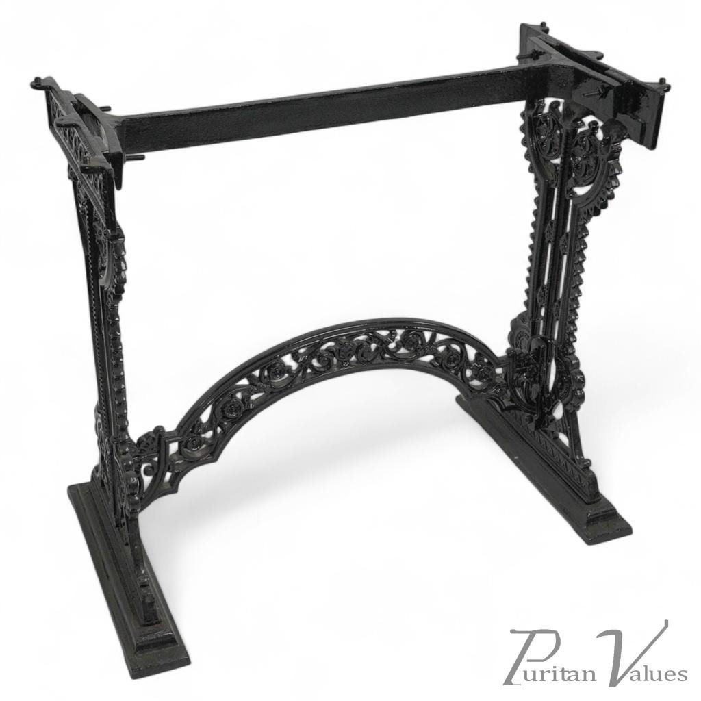 by G. Hufton of Birmingham with stylised floral and zig-zag details throughout, an arched stretcher uniting the side uprights stood on plinth style feet. The table has been gently bead blasted so as not to damage the surface when removing the old rust and then coated with powder paint designed specially to resist outside use.