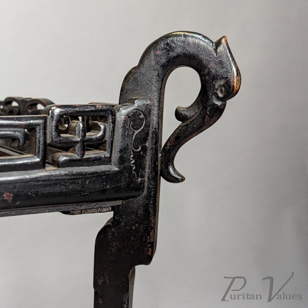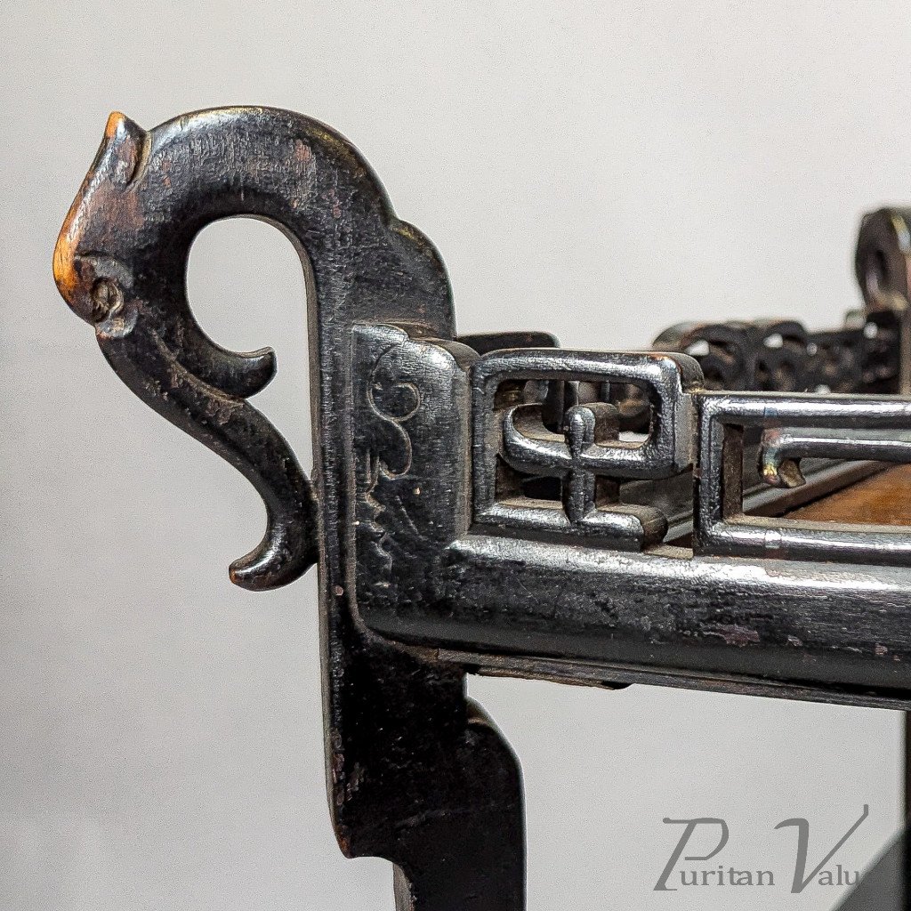 An Aesthetic Movement tea trolley with Japanese style fretwork gallery and raised animal heads to each upper corner with a river scene depicting herons to the top.