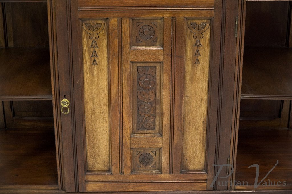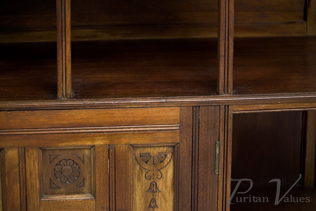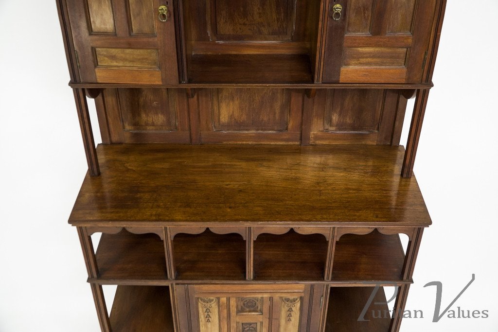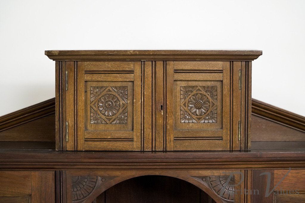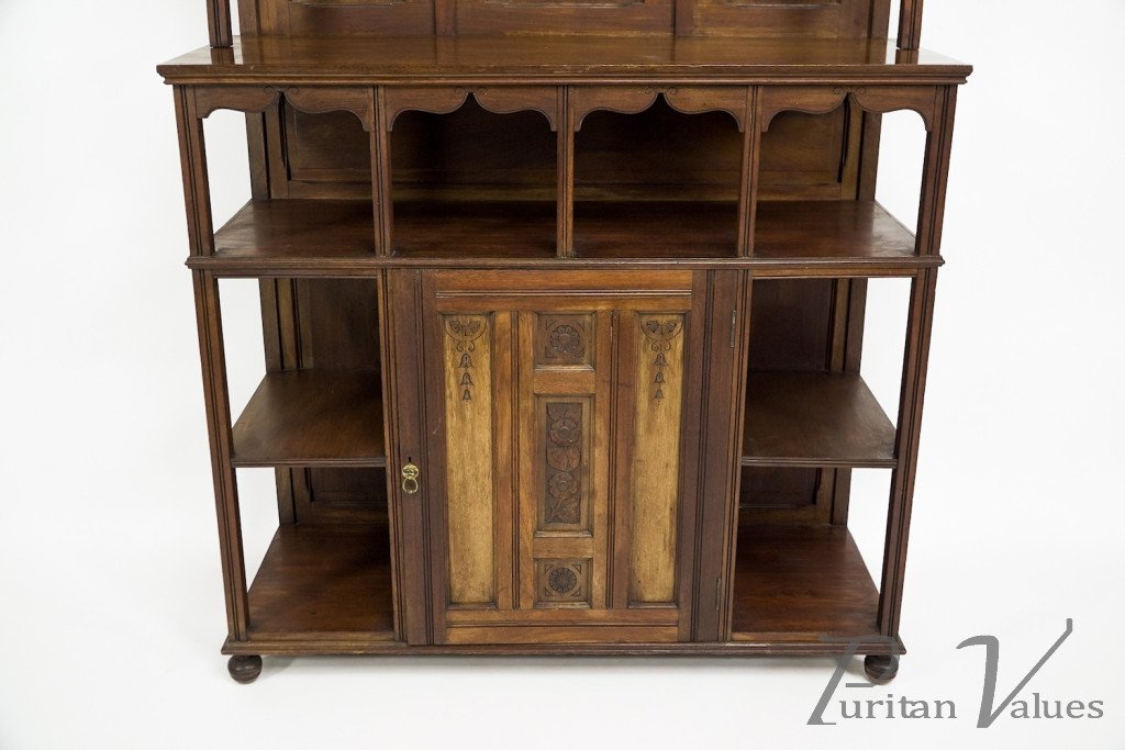 of architectural form with carved floral decoration to the upper and lower cupboard doors, with stylized brass ring pull handles to the doors. Carved quarter sunflower lunettes to the upper section and along the bottom of the upper section and to the sides, with an arrangement of open display shelves. The whole stood on bun feet.