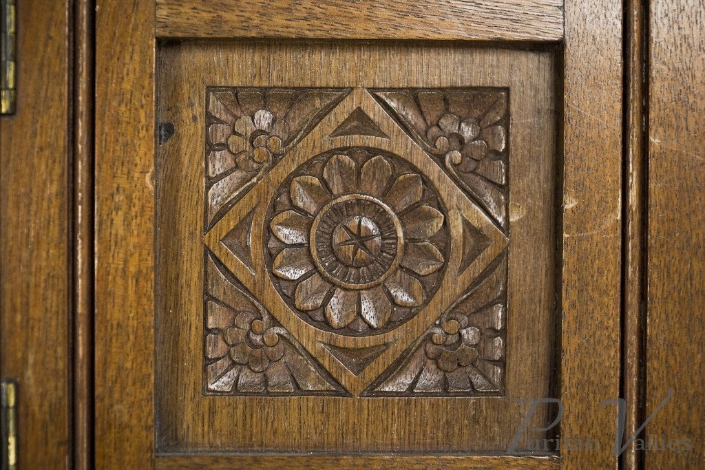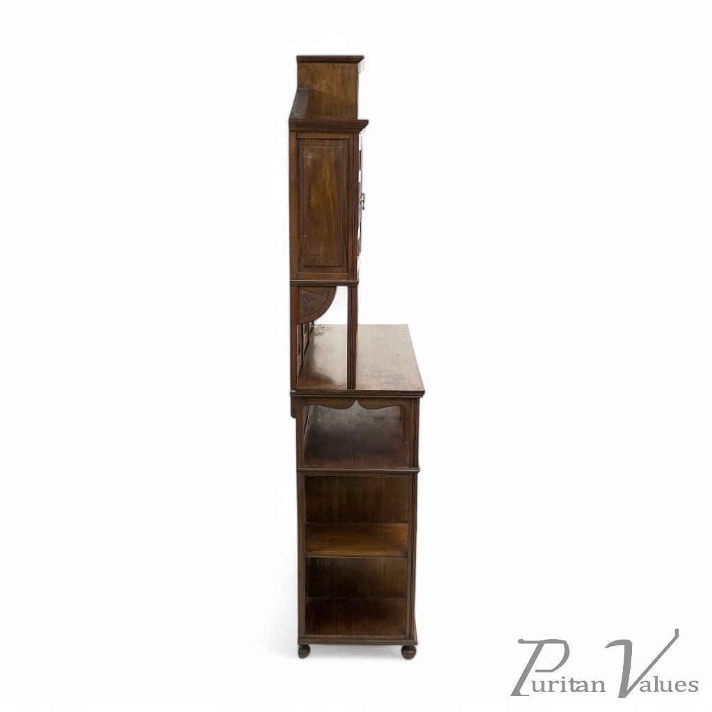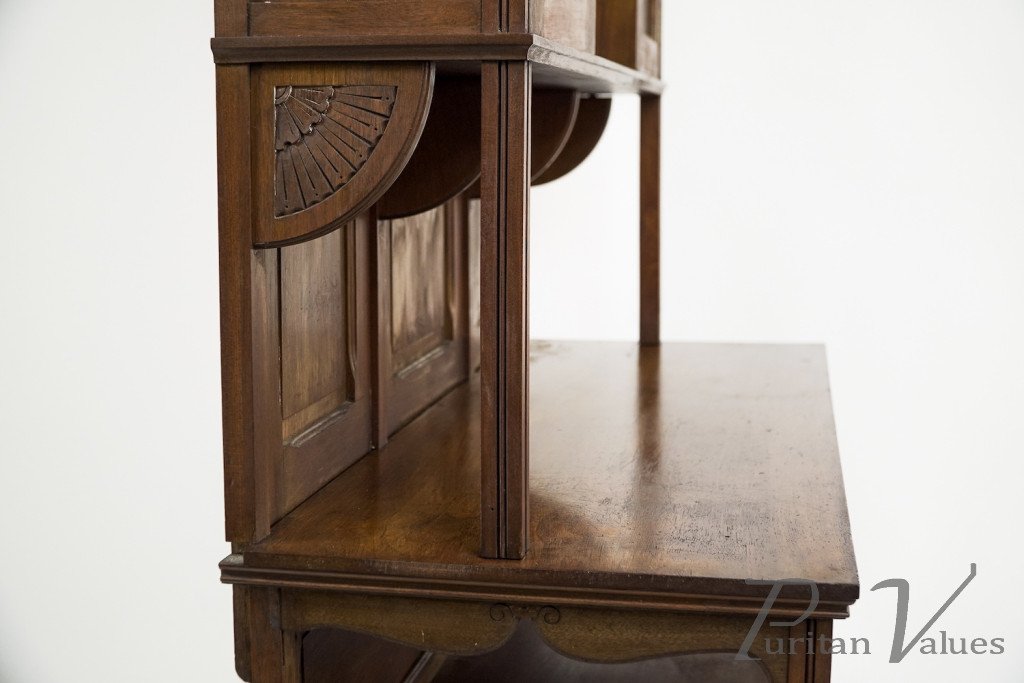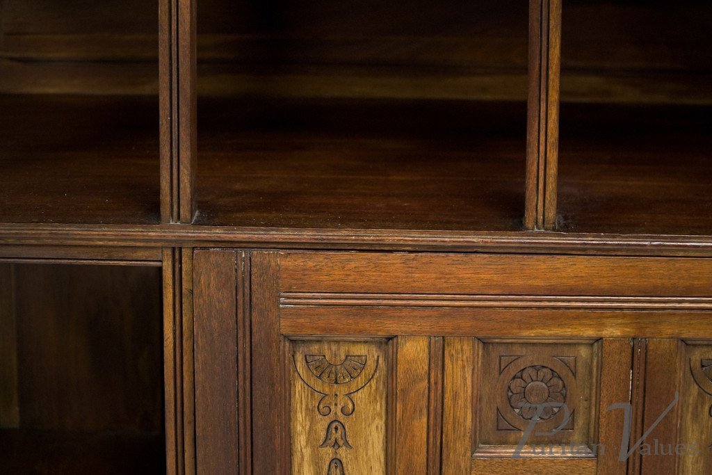 of architectural form with carved floral decoration to the upper and lower cupboard doors, with stylized brass ring pull handles to the doors. Carved quarter sunflower lunettes to the upper section and along the bottom of the upper section and to the sides, with an arrangement of open display shelves. The whole stood on bun feet.