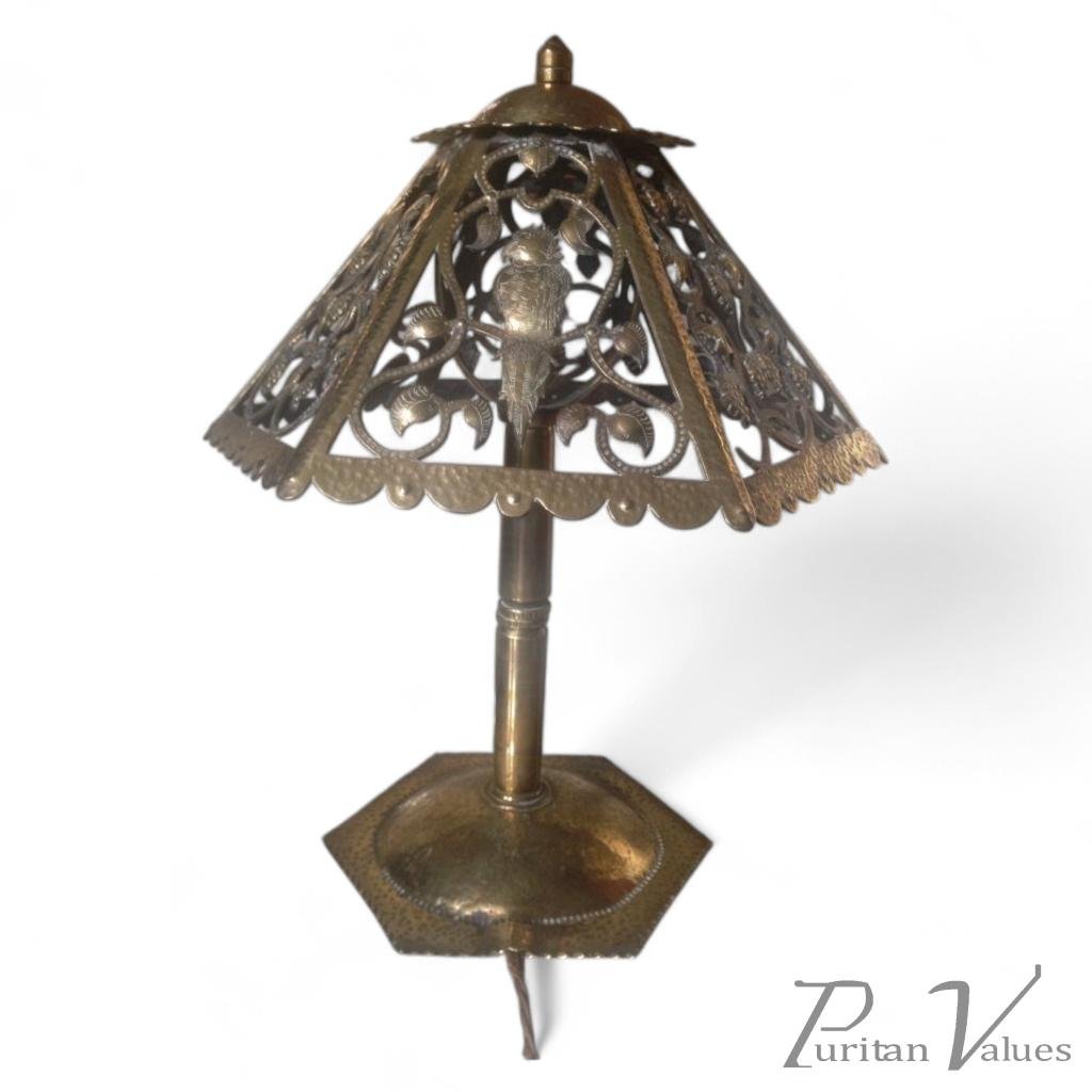 An exceptional Arts and Crafts hand made brass table lamp by Alfred Bucknell with a Heron. A Crane and a Parrot with opposite panels of fruiting vines . Height 17" Width of brass shade 12 1/4".
