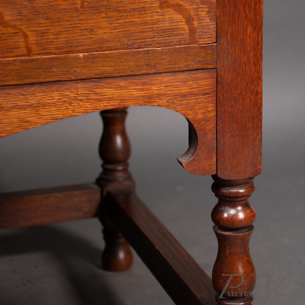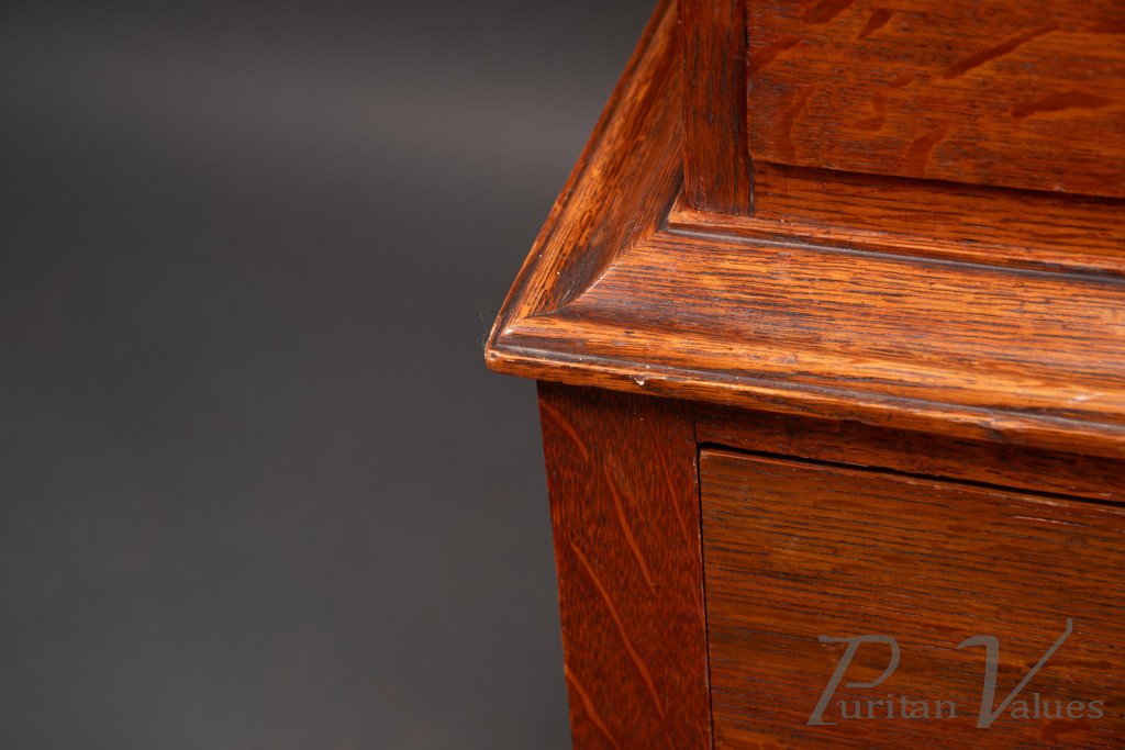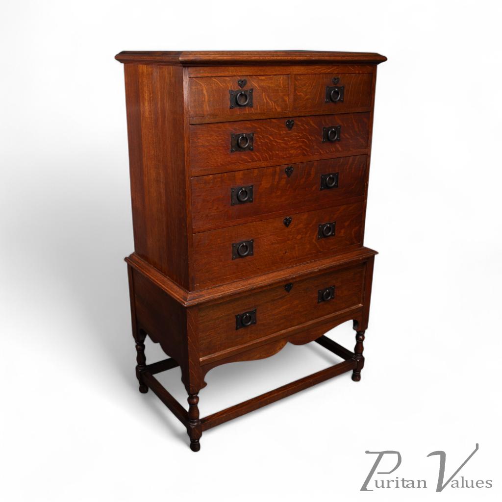 A rare Mansfield oak chest of drawers with iron heart escutcheons and handles in wonderful original condition. The quality is very high, using beautifully figured quarter-sawn oak right down to the drawer sides and bottoms. Separates from the base for easy handling.