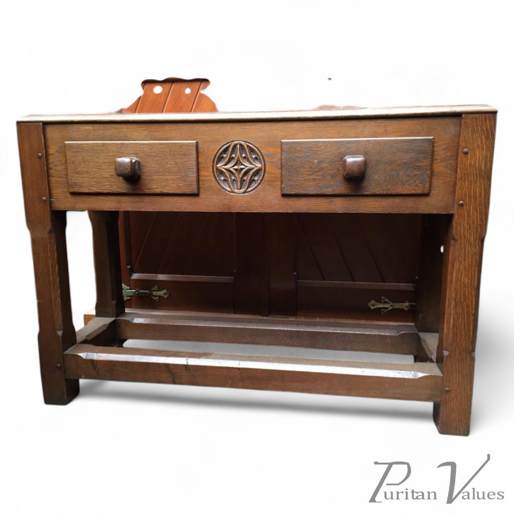 An 1960s oak side table with inset marble top.