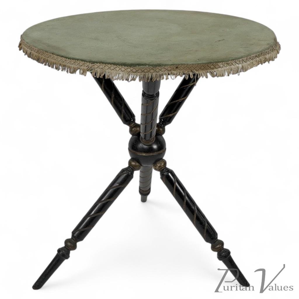 With a circular top, retaining the original green baize top and shallow tassels below. The three upright supports and the three legs meet to a central ball in the middle.