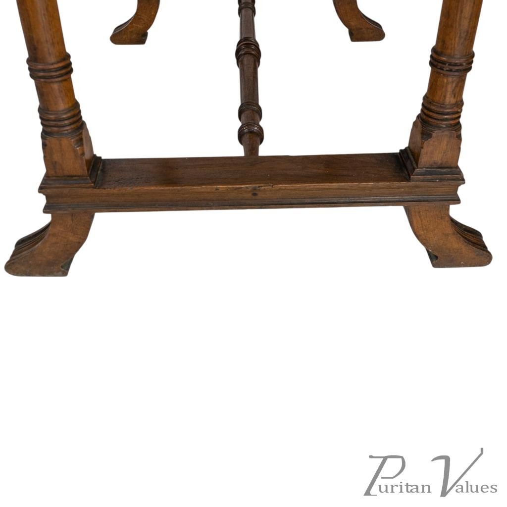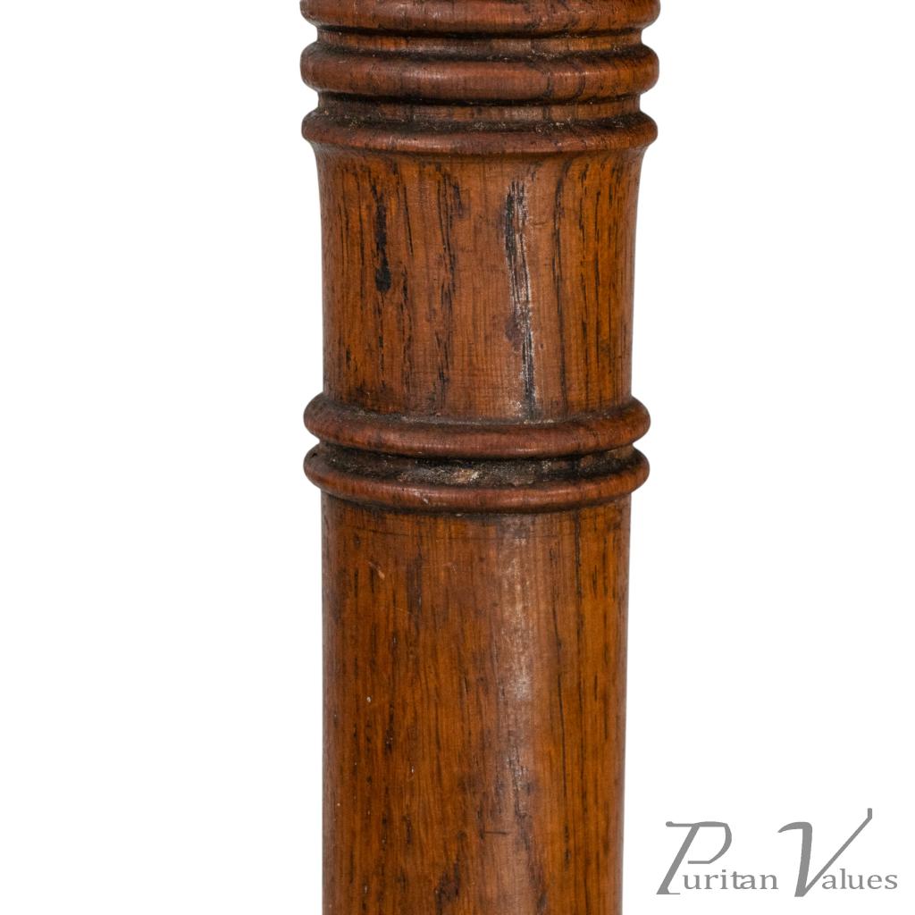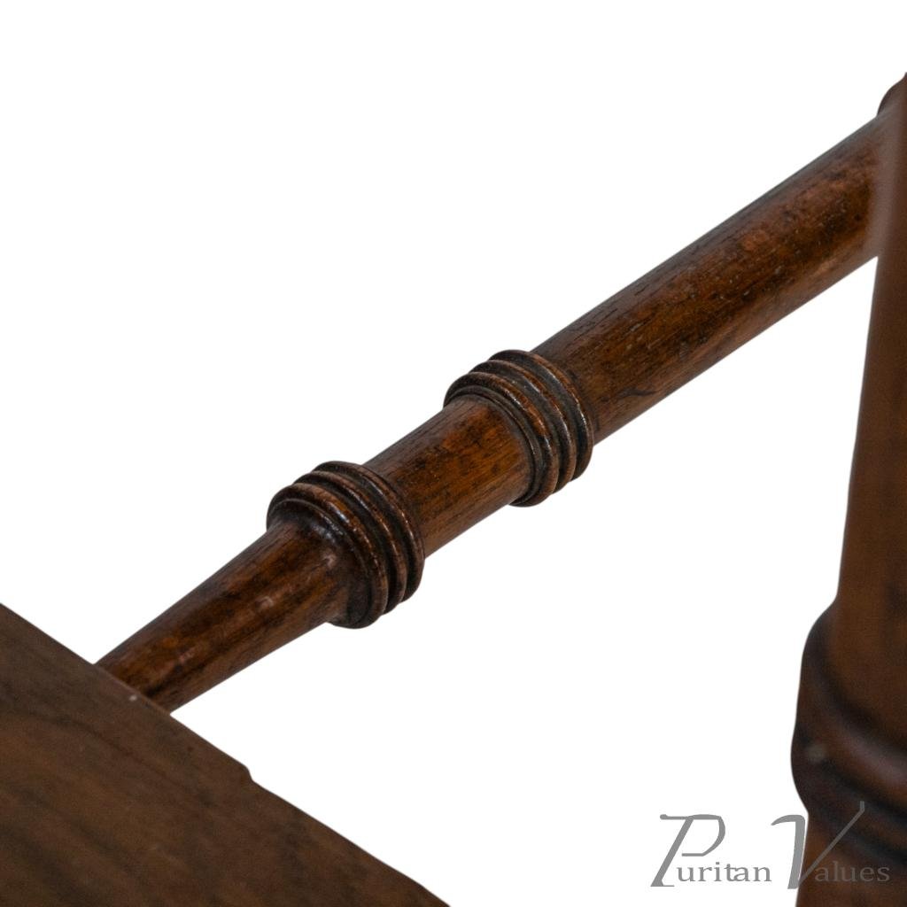 with staggered ring turnings to the legs and stood on splayed-out feet united by a fine ring-turned central stretcher.