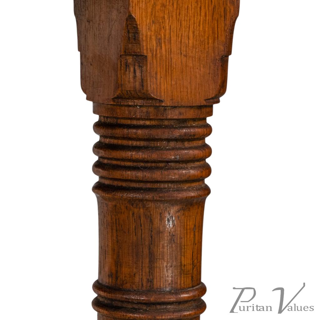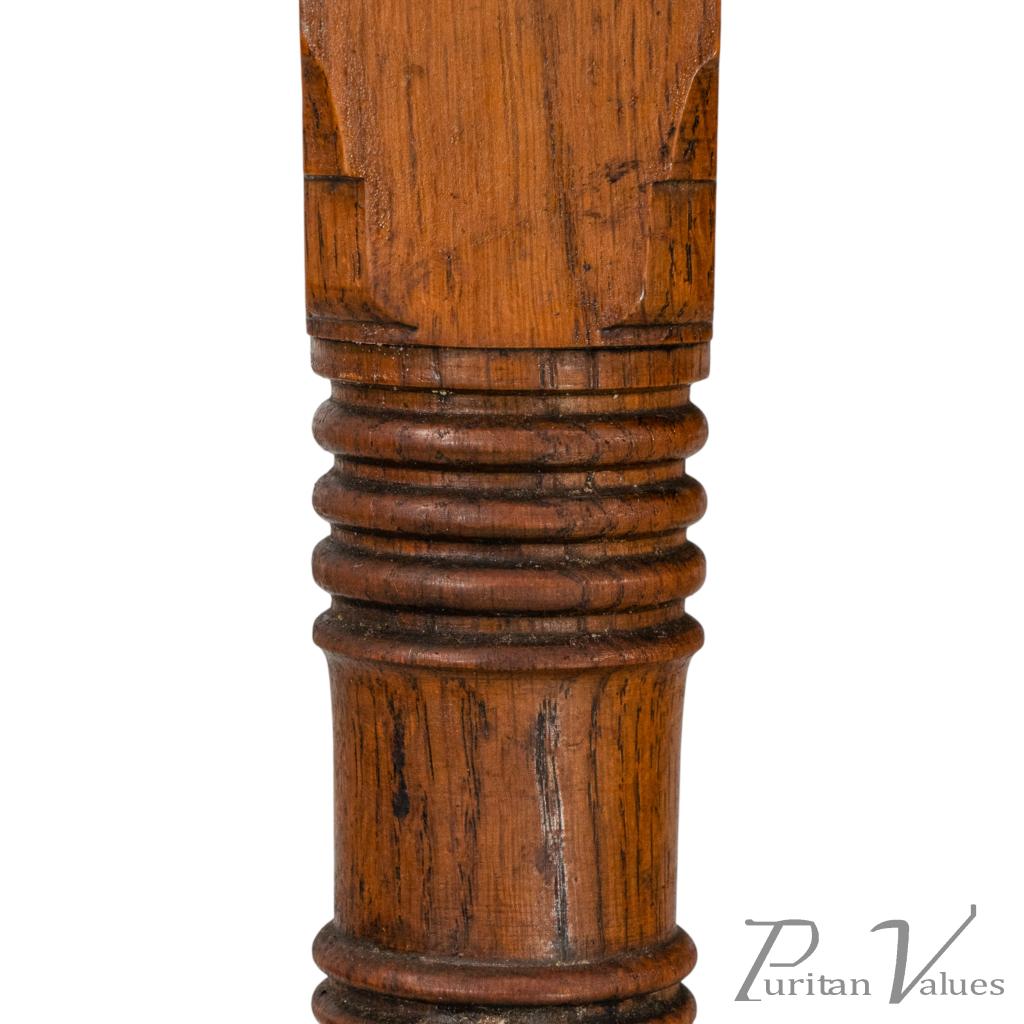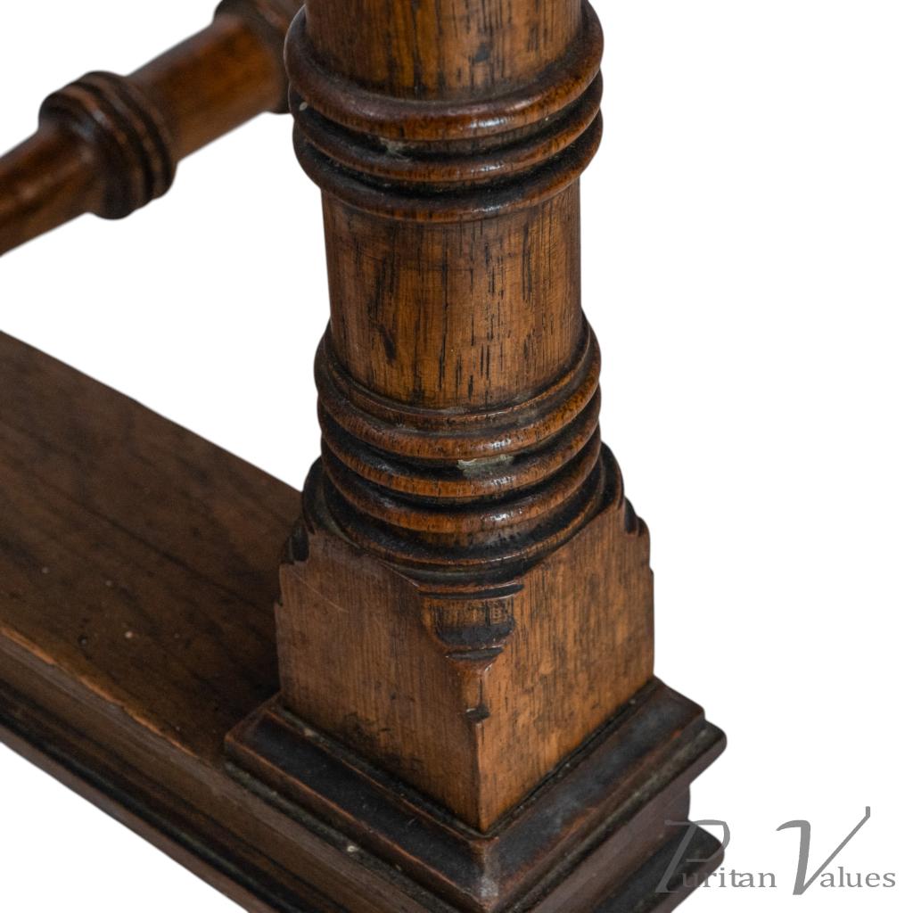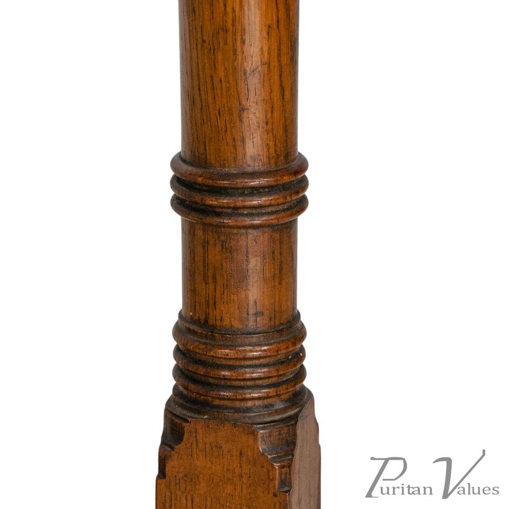 with staggered ring turnings to the legs and stood on splayed-out feet united by a fine ring-turned central stretcher.
