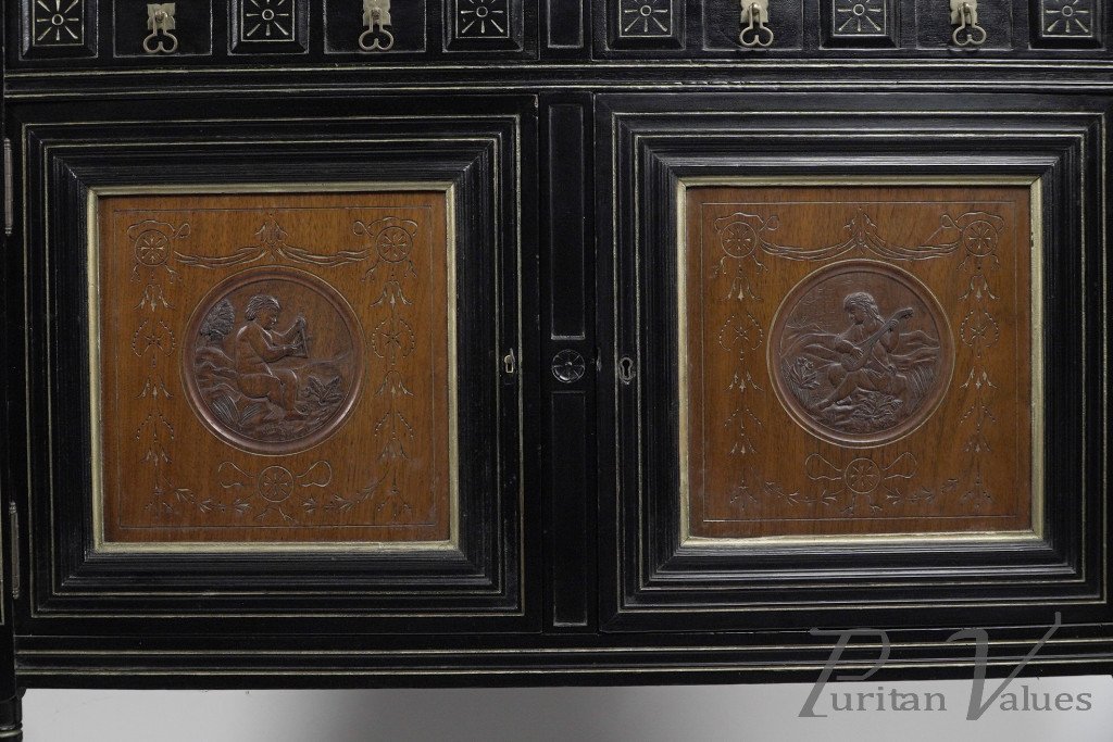 An Aesthetic Movement part ebonized side cabinet with carved and gilt sunflower florets to the back with finely carved panels of Putti Putti playing music.
