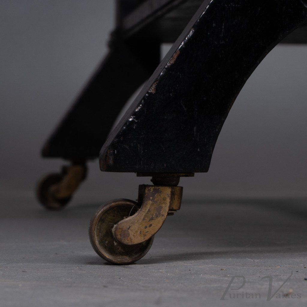 on four turned and incised legs united by a lower stretcher with a turned gallery around on original brass and ceramic castors.