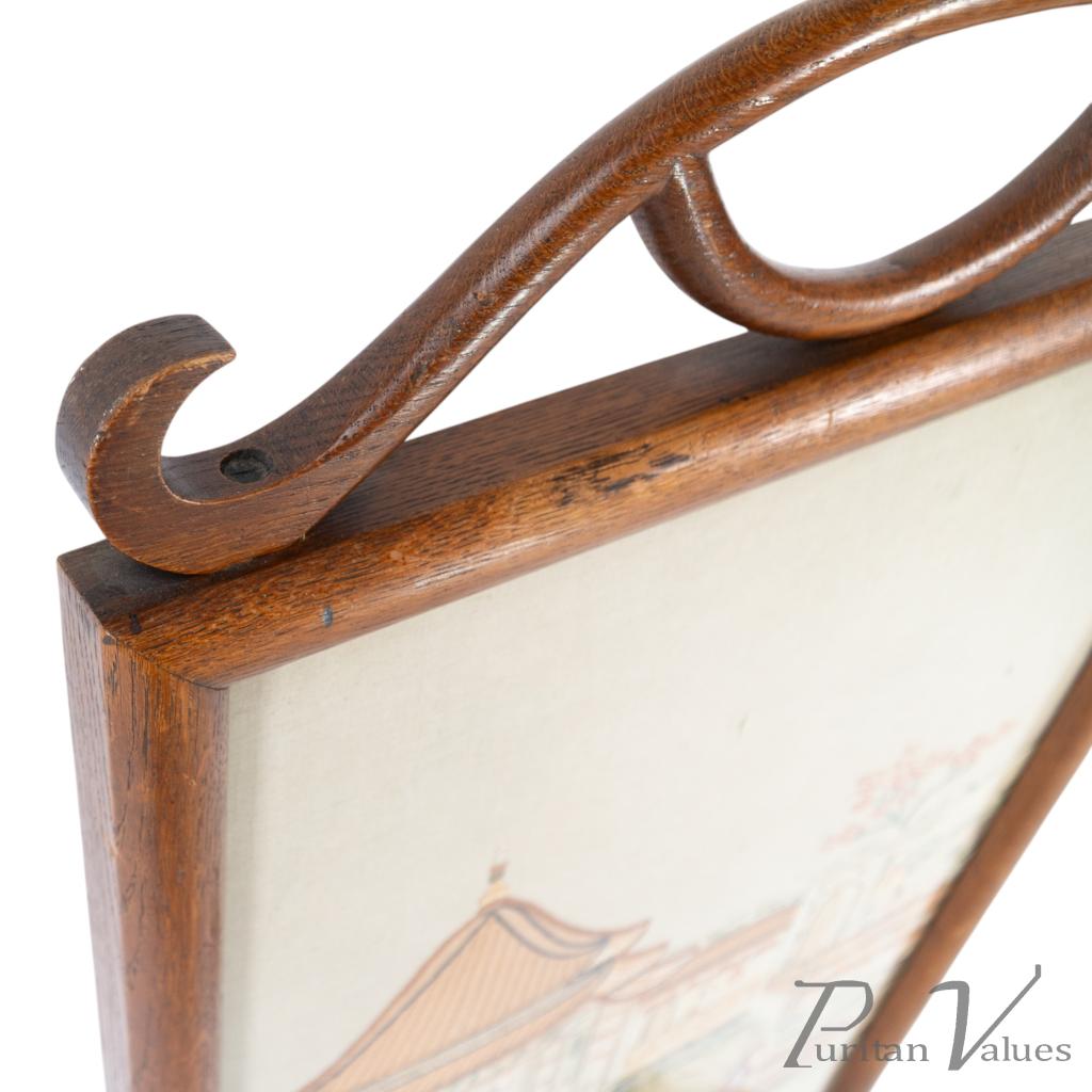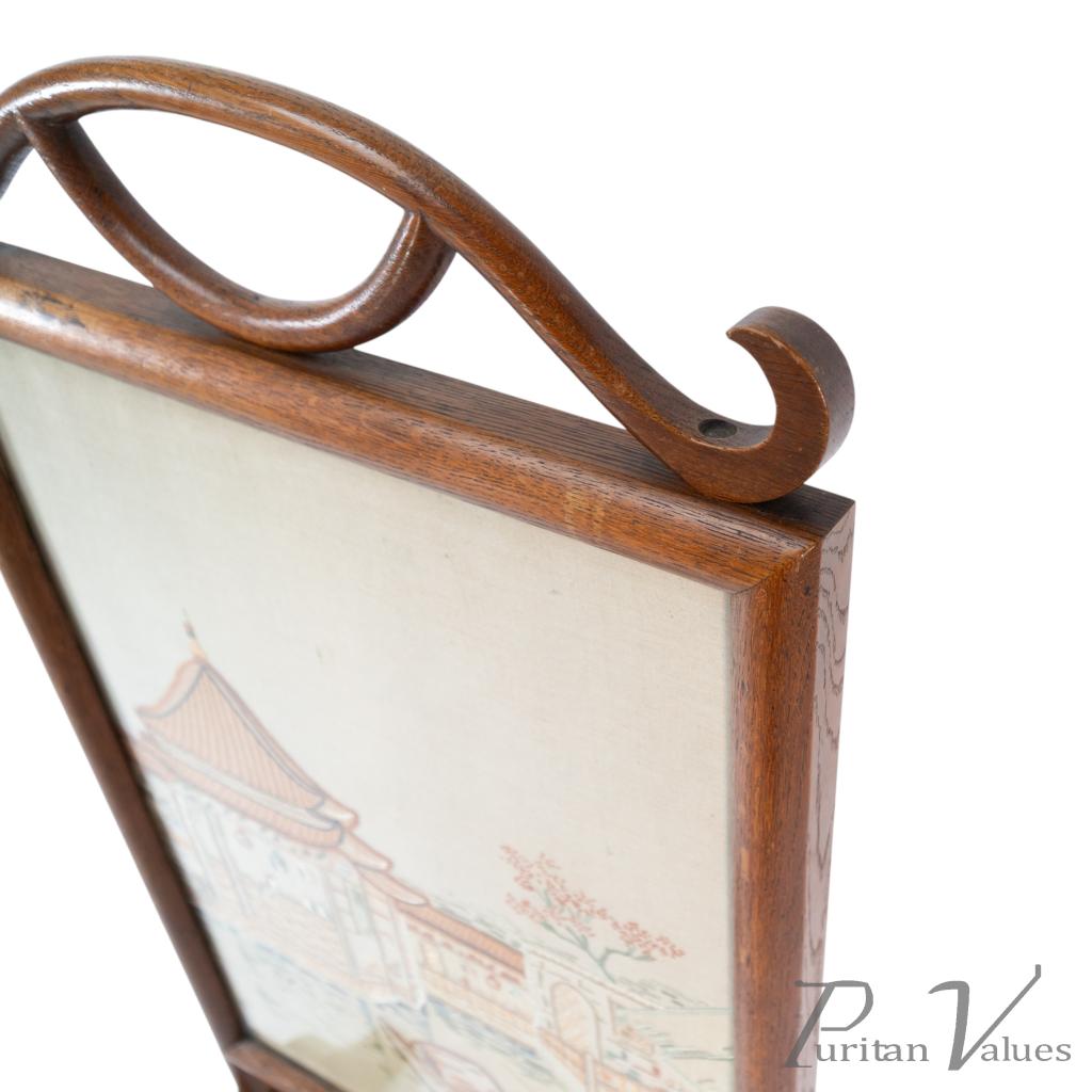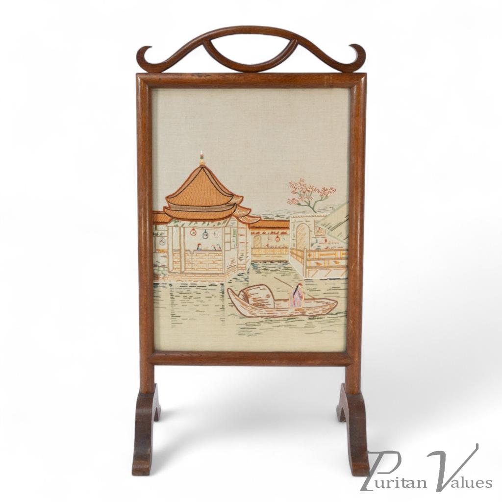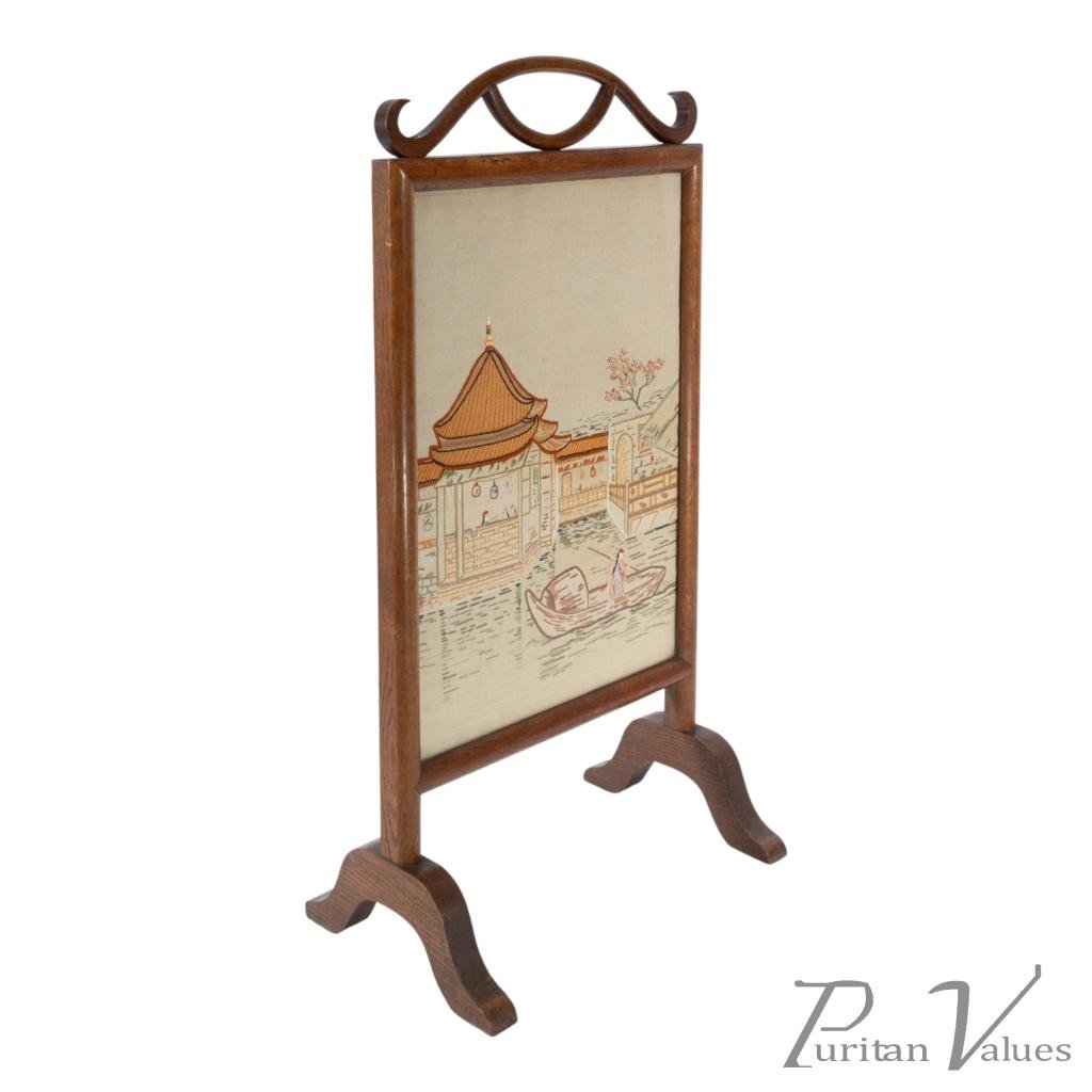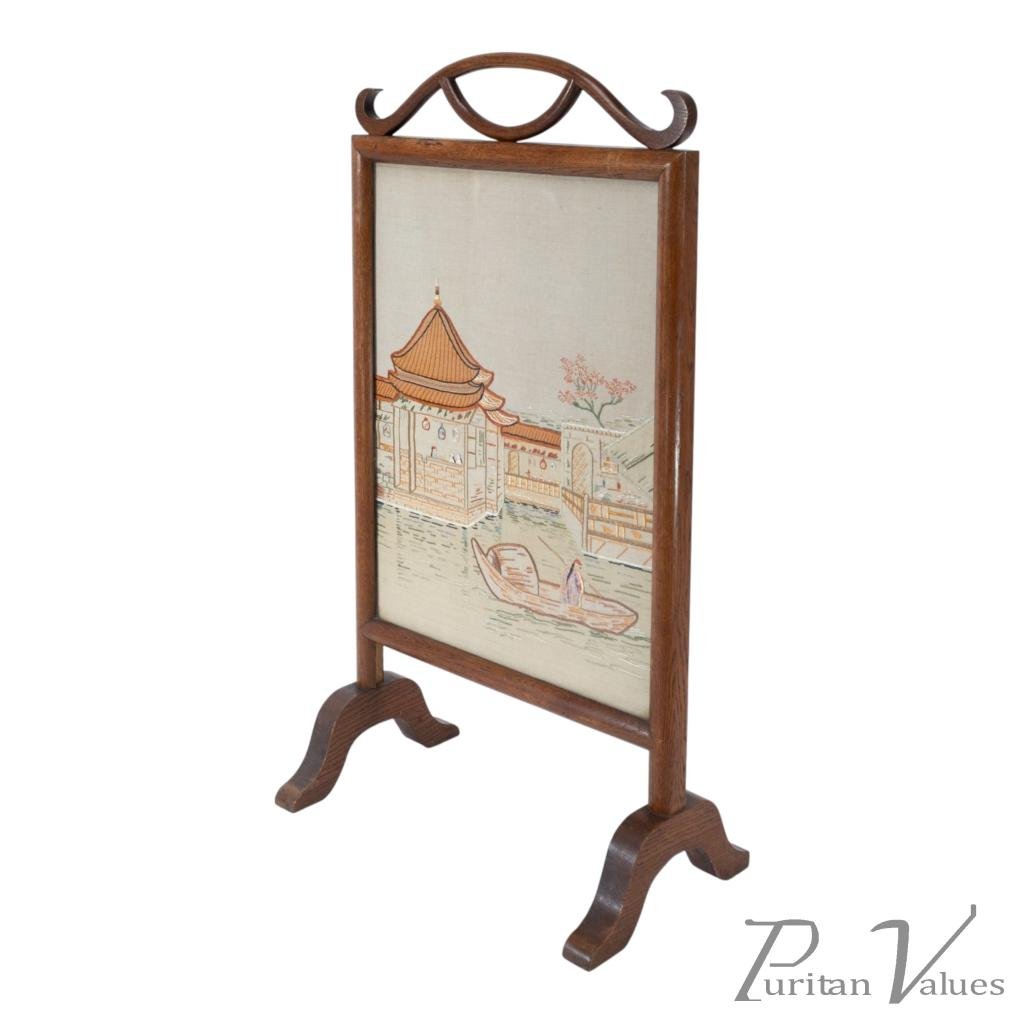 firescreen in oak aligned to the Aesthetic Movement (1880–1889), c.1885, in the Anglo-Japanese mode. The upper rail carries a torii gate motif, with an embroidered panel depicting a tranquil river scene with architecture and boats. An upright frame offers a tidy footprint suitable for hearthside placement. A visible construction cue is the framed textile panel held within the timber surround, presenting a balanced and compact stance without visual excess. Within the broader Anglo-Japanese vocabulary of the Aesthetic Movement, the torii crest and pictorial textile echo Japonisme taste while remaining restrained.