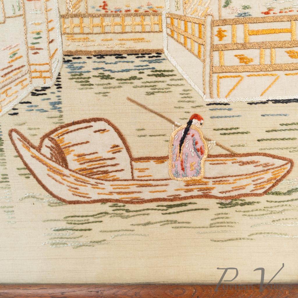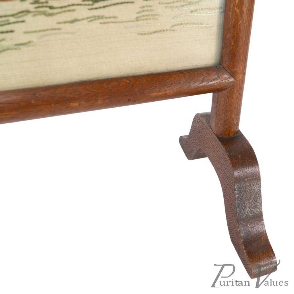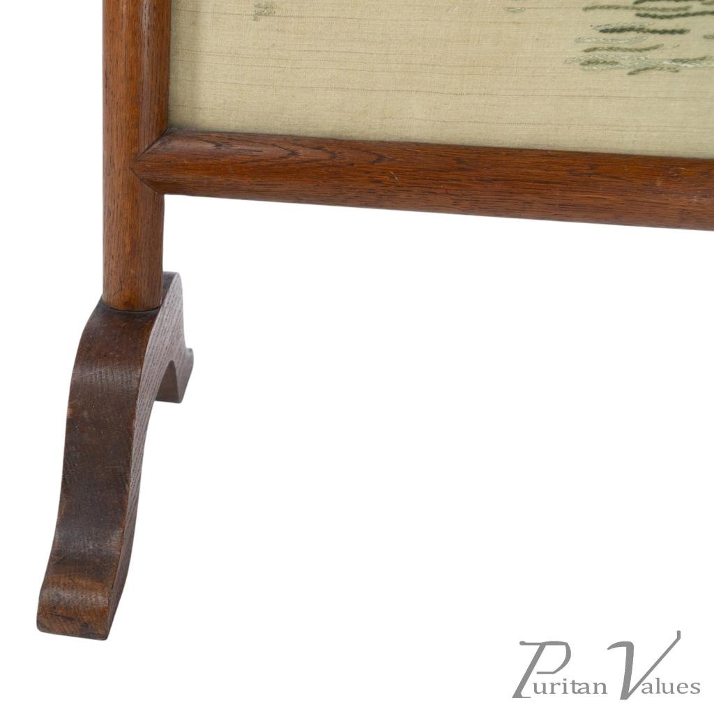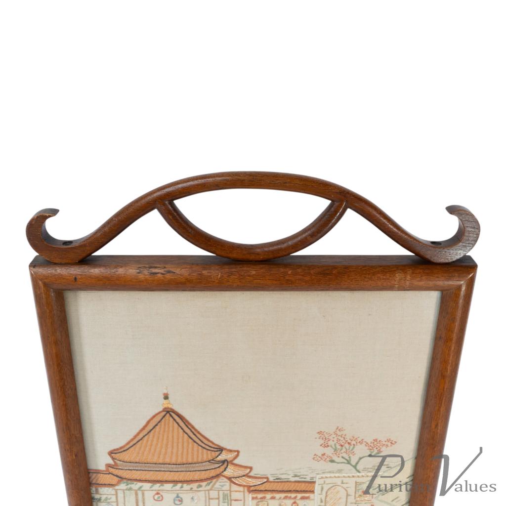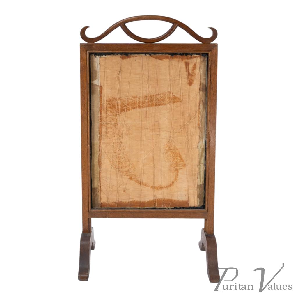 firescreen in oak aligned to the Aesthetic Movement (1880–1889), c.1885, in the Anglo-Japanese mode. The upper rail carries a torii gate motif, with an embroidered panel depicting a tranquil river scene with architecture and boats. An upright frame offers a tidy footprint suitable for hearthside placement. A visible construction cue is the framed textile panel held within the timber surround, presenting a balanced and compact stance without visual excess. Within the broader Anglo-Japanese vocabulary of the Aesthetic Movement, the torii crest and pictorial textile echo Japonisme taste while remaining restrained.