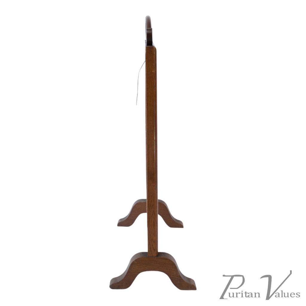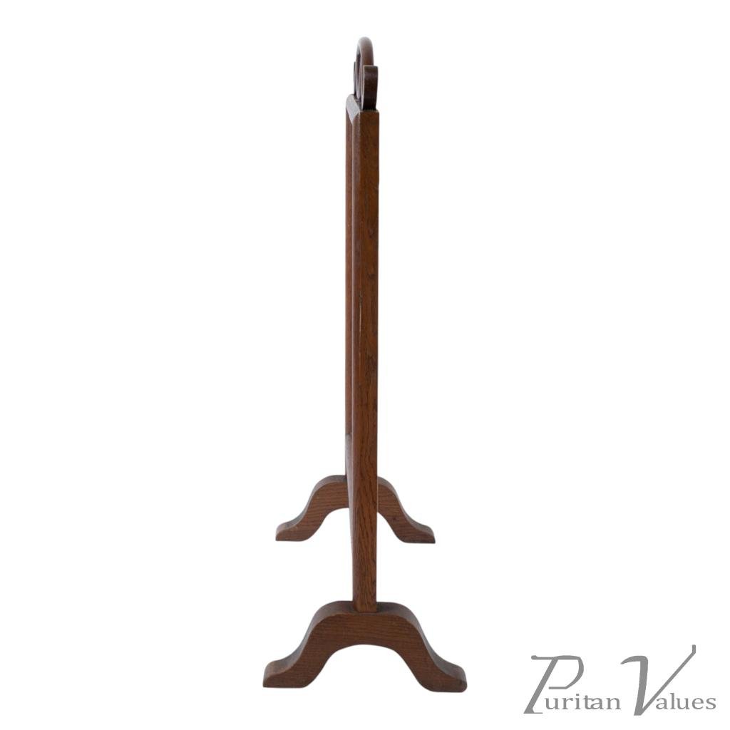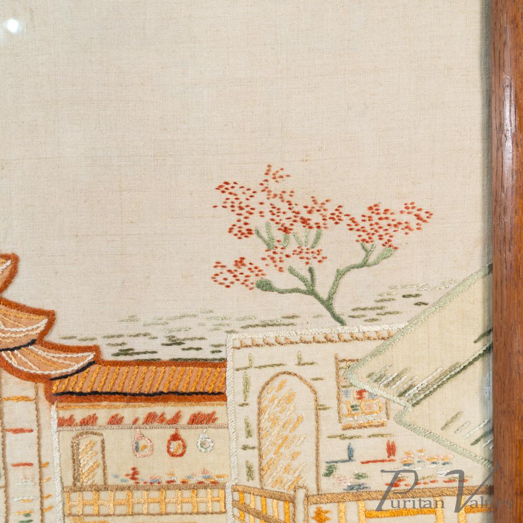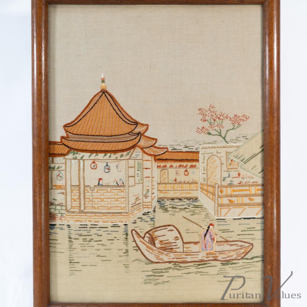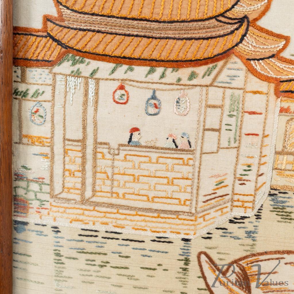firescreen in oak aligned to the Aesthetic Movement (1880–1889), c.1885, in the Anglo-Japanese mode. The upper rail carries a torii gate motif, with an embroidered panel depicting a tranquil river scene with architecture and boats. An upright frame offers a tidy footprint suitable for hearthside placement. A visible construction cue is the framed textile panel held within the timber surround, presenting a balanced and compact stance without visual excess. Within the broader Anglo-Japanese vocabulary of the Aesthetic Movement, the torii crest and pictorial textile echo Japonisme taste while remaining restrained.