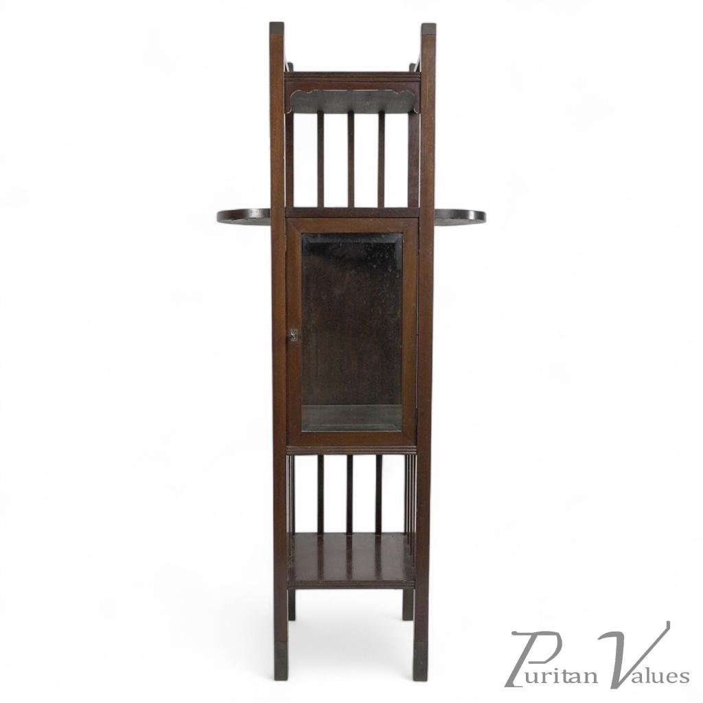 An Anglo-Japanese style mahogany side cabinet of slender form with upper extending display wings, a beveled glass door, and glass sides, a sign of good quality, standing on brass sabot feet.