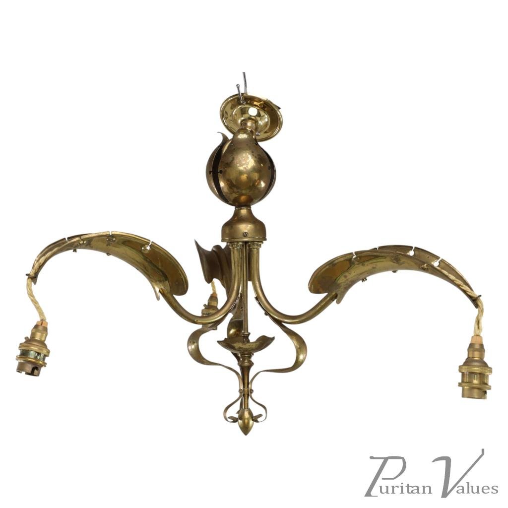An Arts and Crafts brass three arm ceiling light